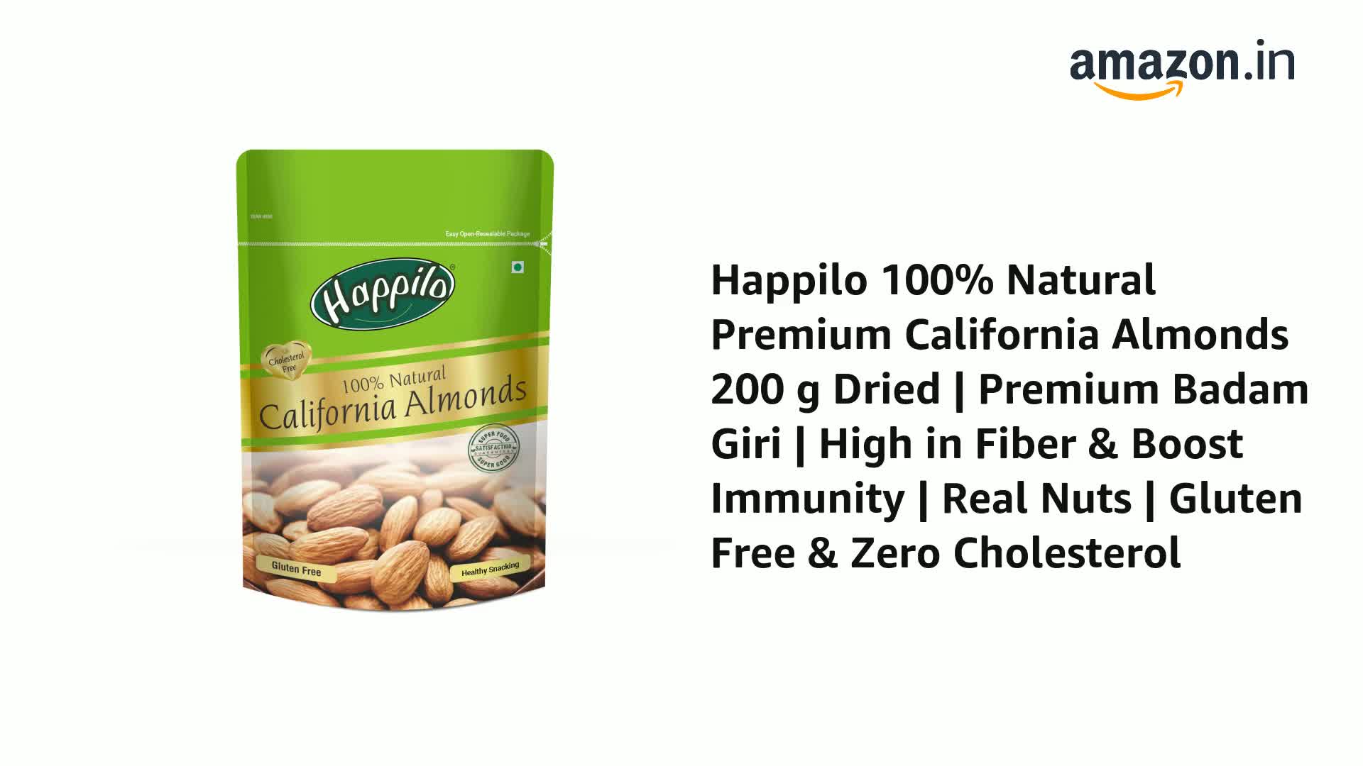 Perfect for a health snack. Time to be happy lovely & healthy. Gluten free High in protein Almonds High protein dietary fiber no gluten no GMO zero transfat zero cholesterol 100% Real nuts- good for an active lifestyle Lowers harmful cholesterol levels Rich source of omega-3 anti oxidants & vitamins calcium iron & magnesium Hearts best friend improves cardiovascular system
