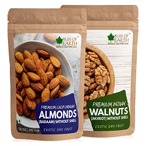 Bliss of Earth premium Quality Almonds are highly nutritious and rich in healthy fats antioxidants vitamins and minerals. like any other nuts almonds are bursting with nutrition. In fact almonds may be most nutrient-rich tree nut available today. Adding almonds to your diet is a smart and tasty move that can pay dividends for life. Walnut (Akhrot) are a tree nut belonging to the walnut family. They originated in the Mediterranean region and central Asia and have been part of the human diet for thousands of years. Bliss of Earth walnuts are rich in omega-3 fats and contain higher amounts of antioxidants than most other foods.