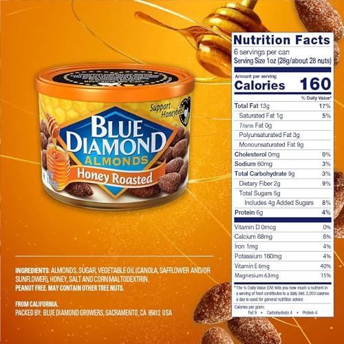 Indulge in the perfect blend of sweet and savoury with these honey roasted almonds. Each premium almond is carefully roasted and coated with real honey for an irresistibly delicious snacking experience. The convenient 150g canister keeps these crunchy treats fresh and ready to enjoy anytime. These flavourful almonds make an excellent snack for your desk an energy boost during outdoor activities or a delightful addition to your party spread. The natural goodness of almonds combined with a touch of honey creates a satisfying crunch that's hard to resist. Perfect for sharing or enjoying solo these honey roasted almonds deliver a consistent taste and quality in every bite. Keep the resealable canister handy in your pantry for whenever you need a flavourful snack that satisfies both sweet and nutty cravings.