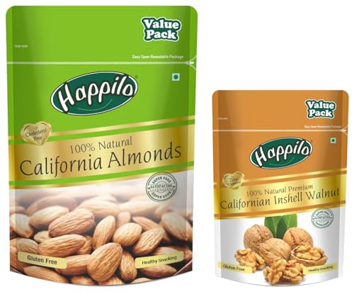 Happilo 100% Natural Premium California Almonds 1kg Value Pack Pouch | Premium Badam Giri | High in Fiber & Boost Immunity | Real Nuts | Whole Natural BadamPerfect for a health snack. Time to be happy lovely & healthy. Gluten free High in protein Almonds High protein dietary fiber no gluten no GMO zero transfat zero cholesterol 100% Real nuts- good for an active lifestyle Lowers harmful cholesterol levels Rich source of omega-3 anti oxidants & vitamins calcium iron & magnesium Hearts best friend improves cardiovascular systemHappilo 100% Natural Californian Inshell Raw Walnut Kernels 500g Value PackWalnuts are deliciously healthy and great for snacking baking or cooking. These in shell raw walnut halves are mainly grown in California and northern India. Eating raw walnuts is one of the easiest things to do to improve your health.Happily has travelled the world to get the finest gourmet dry fruits dried fruits nuts berries and dates. Indulge into the gourmet and grocery world of Happily with awesome nuts and dry fruits along with the unique dry fruit mixes fusions and flavoured dry fruits healthy seeds and dried berries specially crafted for your taste and health. Happilo dry fruit gift boxes and festive dry fruits and nuts gift pack brings health happiness and love to gift to your colleagues friends and family. We bring you the taste and health together in single pack in the finest of packing packed in an art of the state facility certified by all majors like fssai iso. Every Happily pack is a perfect dry fruits gift for every festive occasion.