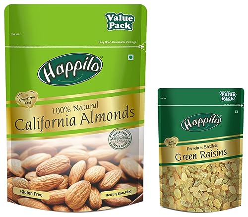Happilo 100% Natural Premium California Almonds 1kg Value Pack Pouch | Premium Badam Giri | High in Fiber & Boost Immunity | Real Nuts | Whole Natural BadamPerfect for a health snack. Time to be happy lovely & healthy. Gluten free High in protein Almonds High protein dietary fiber no gluten no GMO zero transfat zero cholesterol 100% Real nuts- good for an active lifestyle Lowers harmful cholesterol levels Rich source of omega-3 anti oxidants & vitamins calcium iron & magnesium Hearts best friend improves cardiovascular systemHappilo Premium Seedless Green Raisins 500g Value Pack| Kishmish | Nutritious| Rich in IronHappilo has travelled the world to get the finest gourmet dry fruits. They are one of the most nutritious dried fruits in the world they're a yummy healthy snack. Great for Snacking adding to Cereal Cooking and Baking. High Antioxidants Dietary Fiber No Gluten Non GMO Zero Trans Fat & Zero Cholesterol. Daily need products for a healthy and energetic life. Happilo Zip Lock Pouch with airtight seal to ensure the product is protected and fresh. Quality assured - Happilo products are rigorously tested against the industry's best quality standards.