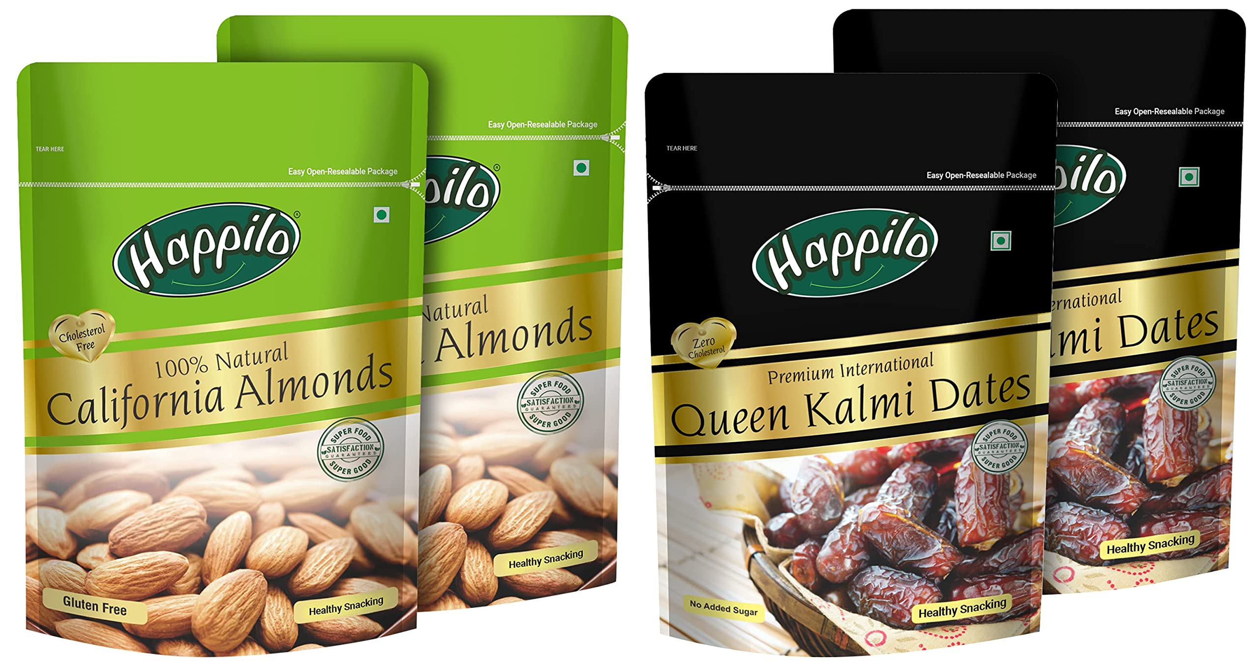 Happilo 100% Natural Premium Californian Almonds 200g (DriedPack of 2)Happily has travelled the world to get the finest gourmet dry fruits dried fruits nuts berries and dates 100 percent natural and authentic. Indulge into the gourmet and grocery world of Happily with awesome natural nuts and dry fruits along with the unique dry fruit mixes fusions and flavoured dry fruits healthy seeds and dried berries specially crafted for your taste and health. Happily dry fruit gift boxes and festive dry fruits and nuts gift pack brings health happiness and love to gift to your colleagues friends and family. We bring you the taste and health together in single pack in the finest of packing packed in an art of the state facility certified by all majors like fssai iso. Every Happily pack is a perfect dry fruits gift for every festive occasion.Happilo Premium International Queen Kalmi Dates 200g (Pack of 2)Happilo has travelled the world to get the finest gourmet dry fruits. They are one of the most nutritious dried fruits in the world they're a yummy healthy snack. Great for Snacking adding to Cereal Cooking and Baking. High Antioxidants Dietary Fiber No Gluten Non GMO Zero Trans Fat & Zero Cholesterol. Daily need products for a healthy and energetic life. Happilo Zip Lock Pouch with airtight seal to ensure the product is protected and fresh. Quality assured - Happilo products are rigorously tested against the industry's best quality standards.