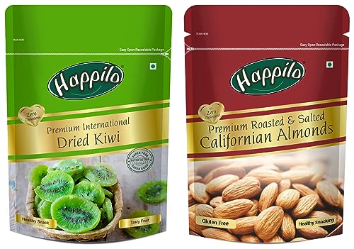 Happilo Premium Californian Almonds Roasted & Salted 200 g | Badam Dry Fruit | High Protein Snack & Super Healthy Crunchy Nuts | Vitamins & Minerals Rich | Freshly Roasted and Lightly SaltedHappilo has travelled the world to get the finest gourmet dry fruits dried fruits nuts berries and dates. Indulge into the gourmet and grocery world of Happily with awesome natural nuts and dry fruits along with the unique dry fruit mixes fusions and flavoured dry fruits healthy seeds and dried berries specially crafted for your taste and health.Happilo Premium International Dried Kiwi Slices 200g Candied Dry Fruit Naturally Sweet and DehydratedLike kiwi eh? We do too and thought it would be awesome to get dried kiwi. And awesome it is! Our dried kiwi has a delicious sweet and slightly tangy taste. These dried kiwi slices have a vibrant green colour that is so much fun to look at but even better to eat. Dried kiwi is a natural digestive aid packed with enzymes fibre and potassium to keep electrolytes in check. They are also a good source of protective antioxidants and immunity-boosting vitamins. Enjoy them as a healthy snack or dip them in chocolate for a real treat! A Brand that is committed to improving the quality of your life Happilo provides food that is packed with the goodness of nature and taste that will keep you wanting for more. With a range of food items across categories like Dry fruits Nuts Seeds Berries Nut Mixes and other healthy items each of our products is not only 100% Natural but is also made of 100% Whole Grains. While we stand strongly for Health wherein our products have a clear functional benefit we believe that Taste is the most important element when it comes to Snacks. We strive to bring the best range of snacks to you. Healthy Snacking with Happilo Premium Dry Fruits Nuts Seeds Berries & Nut mixes.