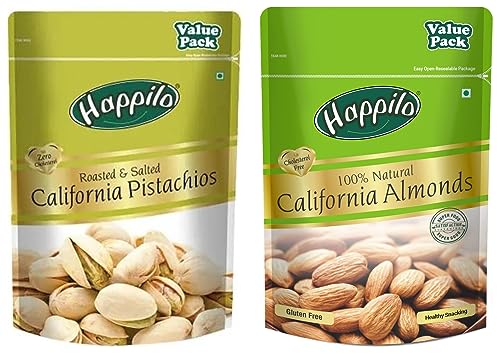 Happilo Premium Californian Roasted & Salted Pistachios 500 gms Value Pack | Pista Dry Fruit Shelled Nuts Super Crunchy & Delicious Healthy Snack | Vitamins & Minerals RichHappilo has travelled the world to get the finest gourmet dry fruits Pistachios are a wonderful fun and tasty snack which are lightly salted. Crack open the shells to treat your taste buds for a snacking sensation.Happilo 100% Natural Premium California Dried Almonds 500g Pack Pouch | Premium Badam Giri | High in Fiber & Boost Immunity | Real Nuts | Gluten FreePerfect for a health snack. Time to be happy lovely & healthy. Gluten free High in protein Almonds High protein dietary fiber no gluten no GMO zero transfat zero cholesterol 100% Real nuts- good for an active lifestyle Lowers harmful cholesterol levels Rich source of omega-3 anti oxidants & vitamins calcium iron & magnesium Hearts best friend improves cardiovascular system