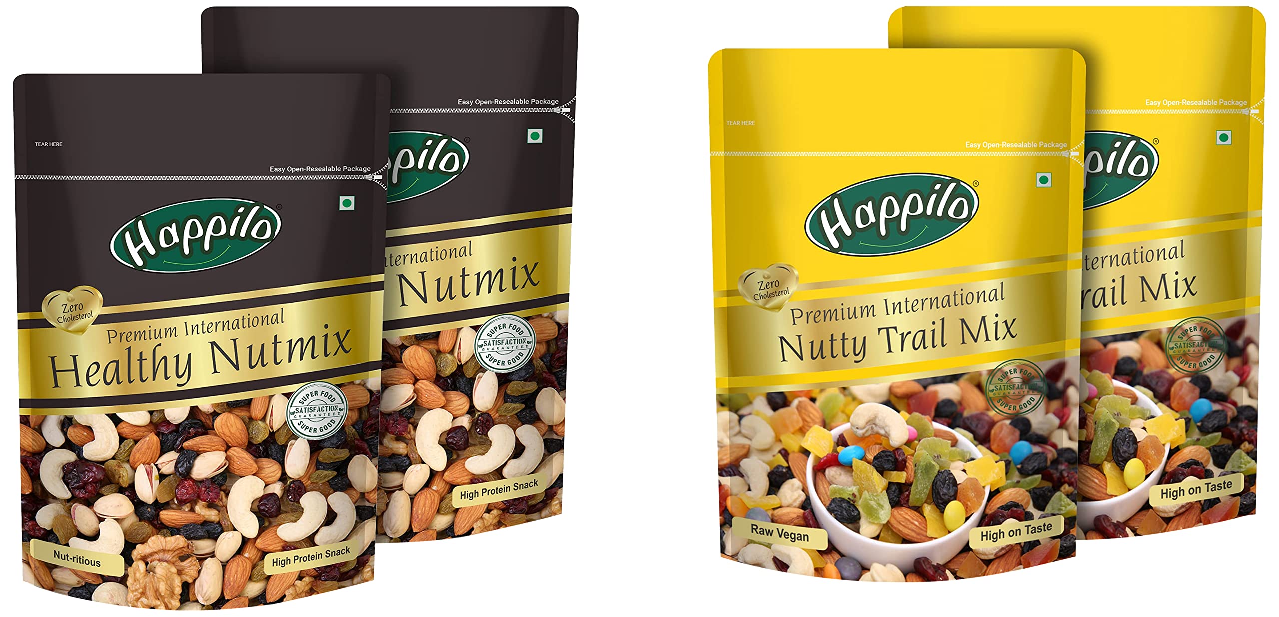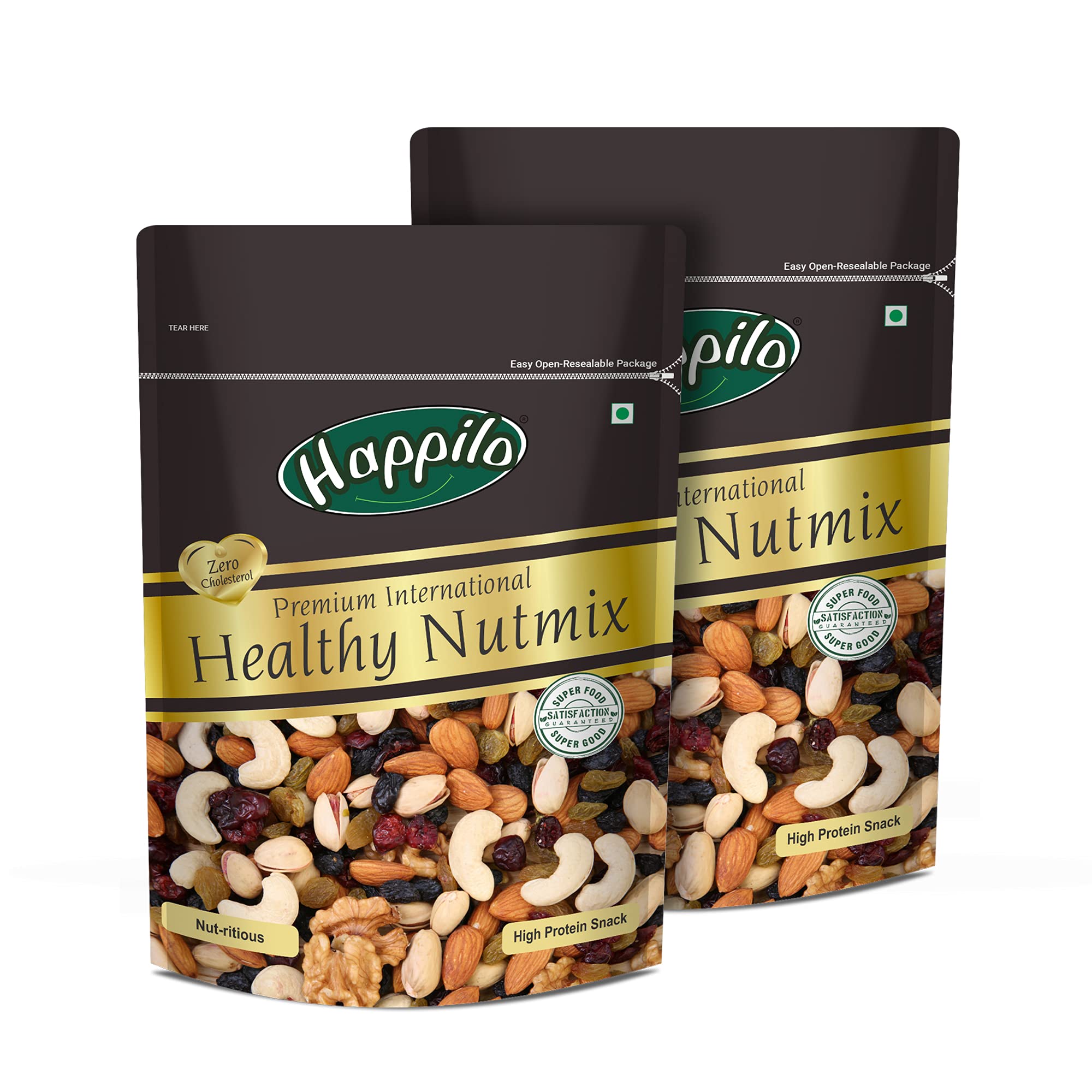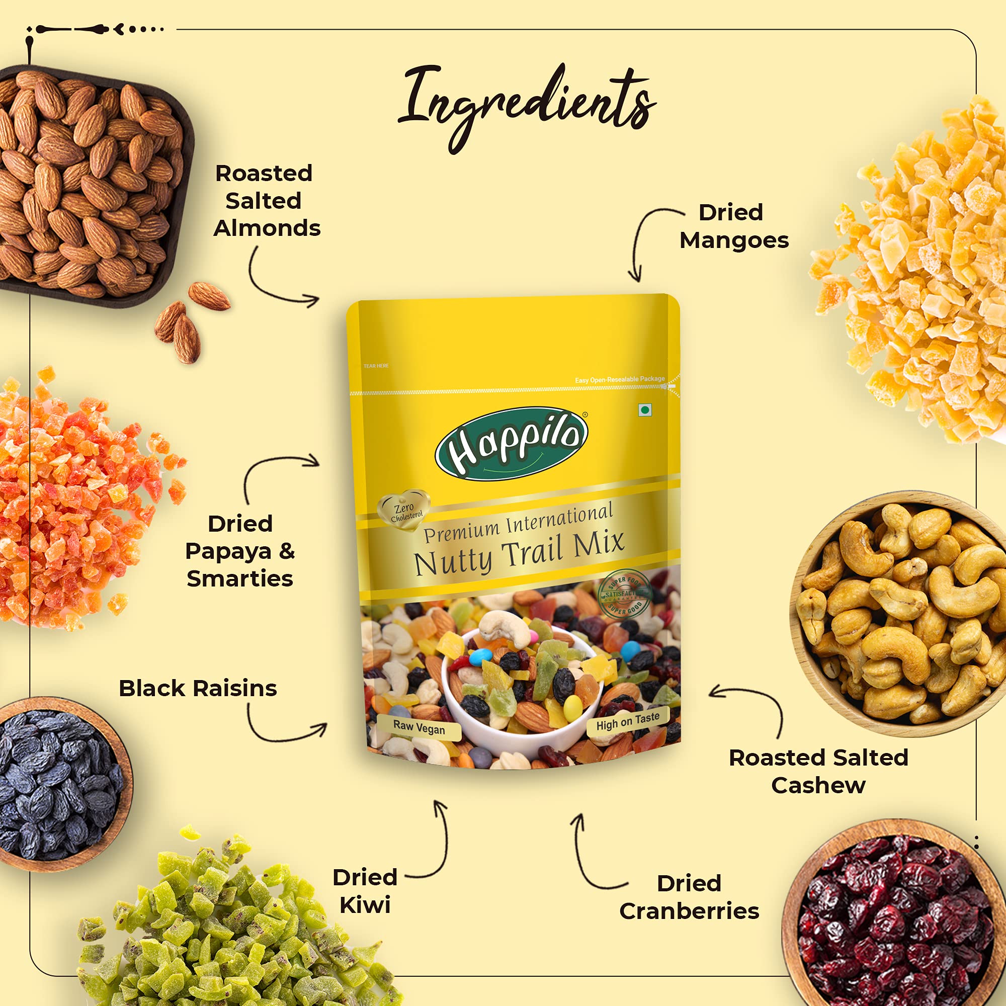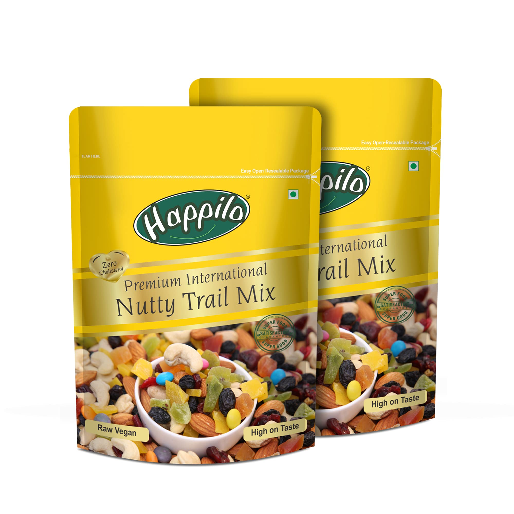 Happilo Premium International Healthy Nutmix 200g (Pack of 2) Dry FruitsHappily has travelled the world to get the finest gourmet dry fruits dried fruits nuts berries and dates 100 percent natural and authentic. Indulge into the gourmet and grocery world of Happily with awesome natural nuts and dry fruits along with the unique dry fruit mixes fusions and flavoured dry fruits healthy seeds and dried berries specially crafted for your taste and health. Happily dry fruit gift boxes and festive dry fruits and nuts gift pack brings health happiness and love to gift to your colleagues friends and family. We bring you the taste and health together in single pack in the finest of packing packed in an art of the state facility certified by all majors like fssai iso. Every Happily pack is a perfect dry fruits gift for every festive occasion.Happilo Premium International Nutty Trail Mix Nuts and Dry Fruits 200g each (Pack of 2) Healthy Snacks with Almonds Raisins Cashew Cranberry Kiwi Mango PapayaIf you are looking for a high energy snack which tastes great then Happilo Trail Mix is perfect for you. A combination of dried fruits nuts smarties makes this a true delight and a perfect gift for your loved ones. High in nutrients and healthiness the mix will certainly keep your mouth shut till you finish eating. Time to be happy lovely and healthy.