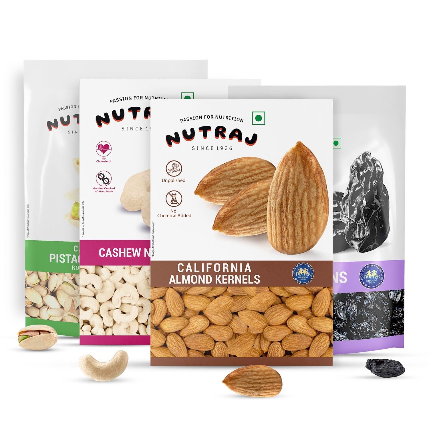 Enjoy a powerful combo that zests your health goals presenting Nutraj Best Dry Fruits Combo Pack that includes 200gm of almonds cashews pistachios and raisins. Made with the right blend of nutrition this combo is appropriate to fulfill your daily nutrition needs. Eat them raw/soaked in the morning or add them to your everyday recipes like salads oatmeal and desserts there are numerous ways to add this combo pack to your daily routine. Shop today!