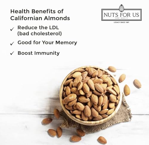 CALIFORNIAN ALMONDS Nuts For Us Californian Almonds are premium quality almonds sourced from the finest farms of California and then hand sorted and packed for our consumers. You can taste the quality in the crunch see the quality in the beautiful golden hue and perfect size. This pack of Californian Almonds is full of nutrients for your consumption. This product is Vegetarian High protein dietary fiber no gluten NON GMO zero transfat zero cholesterol. Almonds are high in magnesium Vitamin E potassium and calcium. An ounce of almonds provide the same amount of calcium as 1/4 cup of milk. Almonds lower LDL or bad cholesterol and lower blood sugar levels thus improving heart health. Almonds even reduce hunger to promote weight loss. Snacking on our almonds will also protect your cells from oxidation and premature aging because of the antioxidant properties in these almonds. Eating almonds also helps in promoting skin hair nails and eye health. Our almonds can be used as a delicious healthy snack or as crunchy toppings for salads oatmeals or parfaits. Keep Refrigerated and Sealed Allergy information: Contains Natural Tree Products. Nuts For Us Green Raisins! Our 400-gram pack of Kishmish is packed with essential nutrients making them a perfect snack for health-conscious individuals. These raisins are not only delicious but also offer numerous health benefits including support for weight loss improved digestion and enhanced bone health. Rich in potassium fiber iron and calcium our green raisins help curb sweet cravings without piling on calories. The high fiber content promotes a feeling of fullness aids in blood sugar control and supports weight management. Additionally their soluble fiber content aids digestion by providing a natural laxative effect while calcium and boron work together to strengthen bones and prevent osteoporosis. Enjoy them as a nutritious snack added to cereals or soaked for optimal benefits!