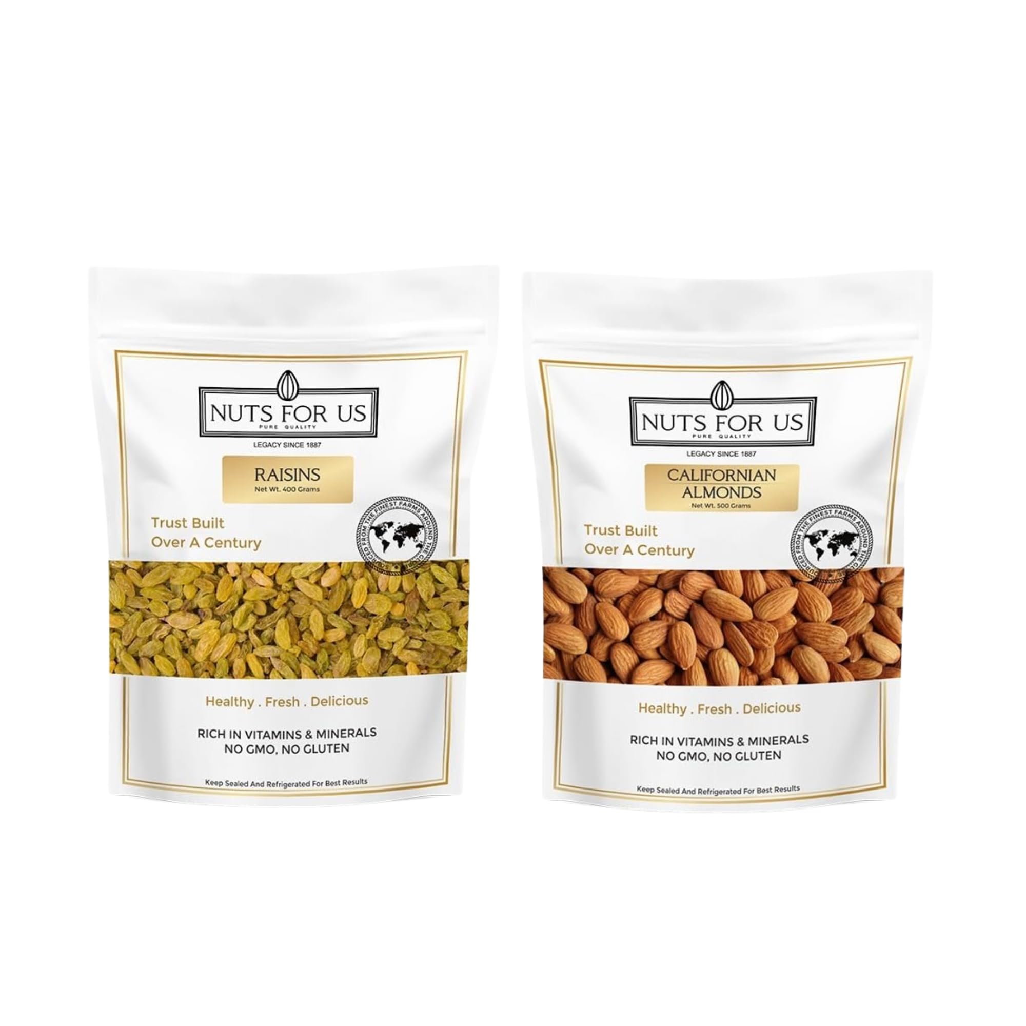 CALIFORNIAN ALMONDS Nuts For Us Californian Almonds are premium quality almonds sourced from the finest farms of California and then hand sorted and packed for our consumers. You can taste the quality in the crunch see the quality in the beautiful golden hue and perfect size. This pack of Californian Almonds is full of nutrients for your consumption. This product is Vegetarian High protein dietary fiber no gluten NON GMO zero transfat zero cholesterol. Almonds are high in magnesium Vitamin E potassium and calcium. An ounce of almonds provide the same amount of calcium as 1/4 cup of milk. Almonds lower LDL or bad cholesterol and lower blood sugar levels thus improving heart health. Almonds even reduce hunger to promote weight loss. Snacking on our almonds will also protect your cells from oxidation and premature aging because of the antioxidant properties in these almonds. Eating almonds also helps in promoting skin hair nails and eye health. Our almonds can be used as a delicious healthy snack or as crunchy toppings for salads oatmeals or parfaits. Keep Refrigerated and Sealed Allergy information: Contains Natural Tree Products. Nuts For Us Green Raisins! Our 400-gram pack of Kishmish is packed with essential nutrients making them a perfect snack for health-conscious individuals. These raisins are not only delicious but also offer numerous health benefits including support for weight loss improved digestion and enhanced bone health. Rich in potassium fiber iron and calcium our green raisins help curb sweet cravings without piling on calories. The high fiber content promotes a feeling of fullness aids in blood sugar control and supports weight management. Additionally their soluble fiber content aids digestion by providing a natural laxative effect while calcium and boron work together to strengthen bones and prevent osteoporosis. Enjoy them as a nutritious snack added to cereals or soaked for optimal benefits!