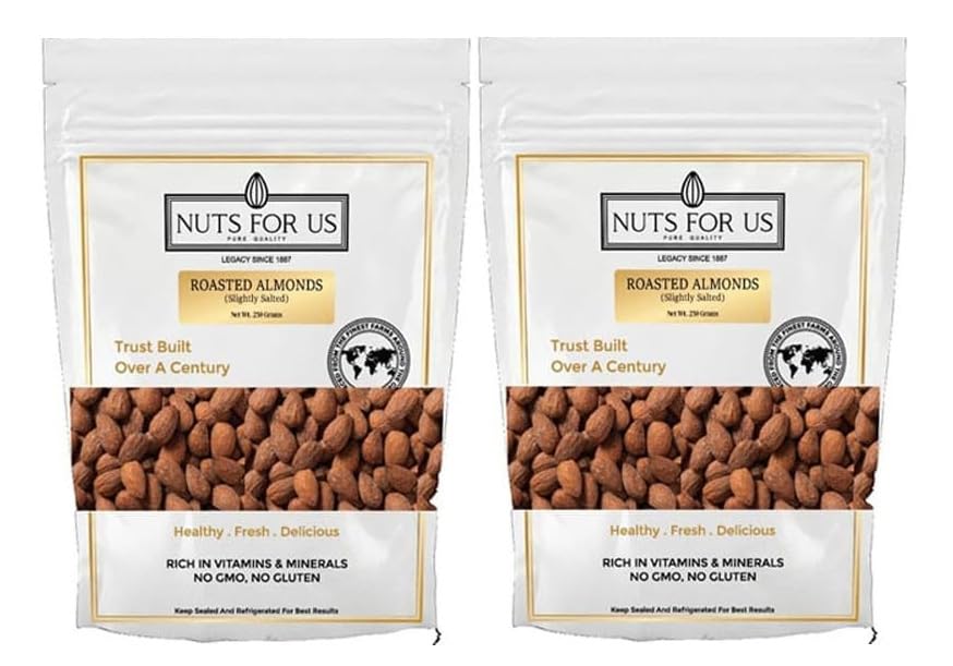 Nuts For Us Roasted Almonds! Our 250-gram pack of 2 features a carefully selected blend of premium white and golden almonds ensuring exceptional quality and freshness. Each almond is roasted to perfection delivering a rich nutty flavor and satisfying crunch that everyone will love. Packed with nutrients these almonds are an excellent source of Vitamin E fiber and protein making them a healthy snack option for both kids and adults. Enjoy them as a standalone treat add them to your favorite dishes or use them as a topping for salads and desserts. With no artificial colors or preservatives you can indulge guilt-free!