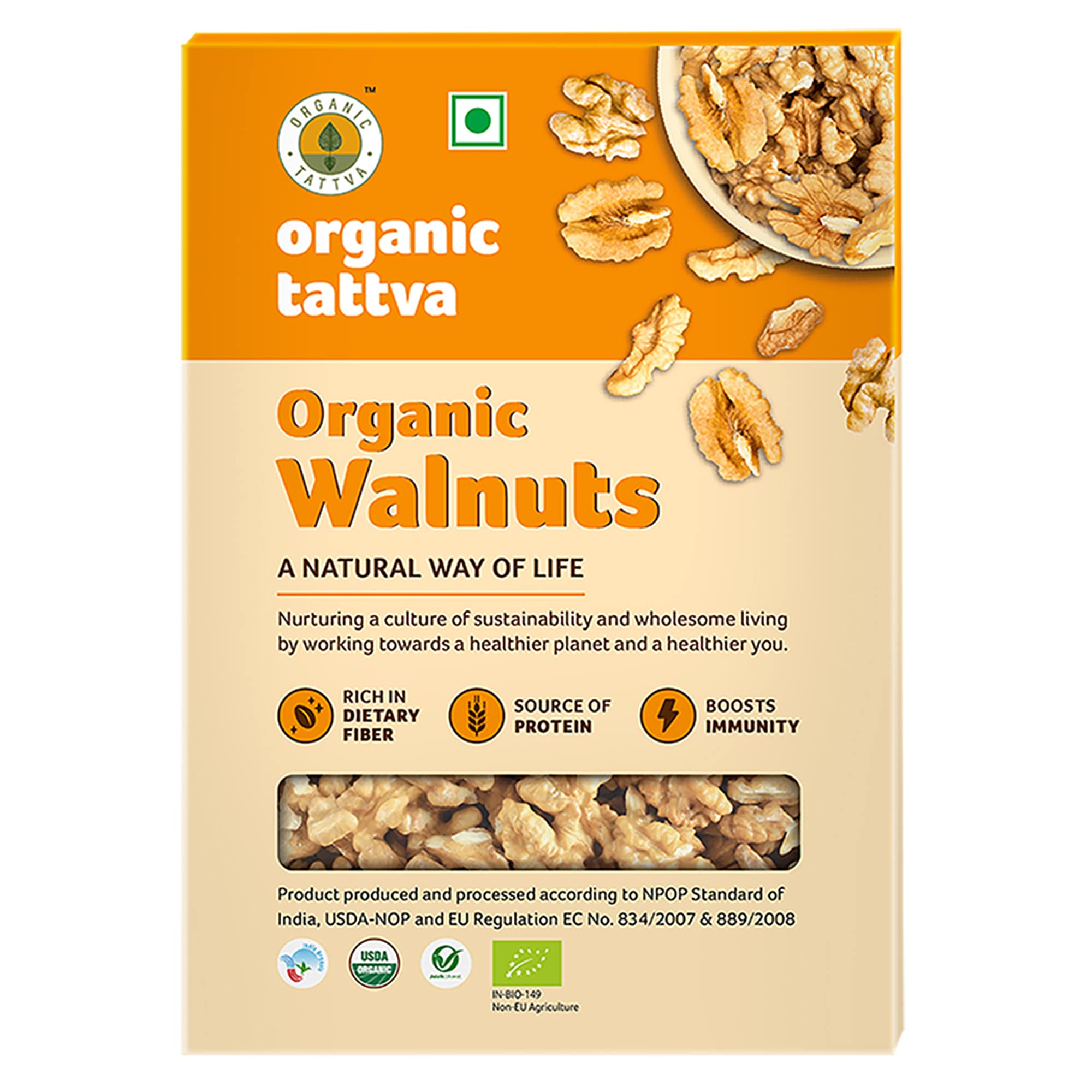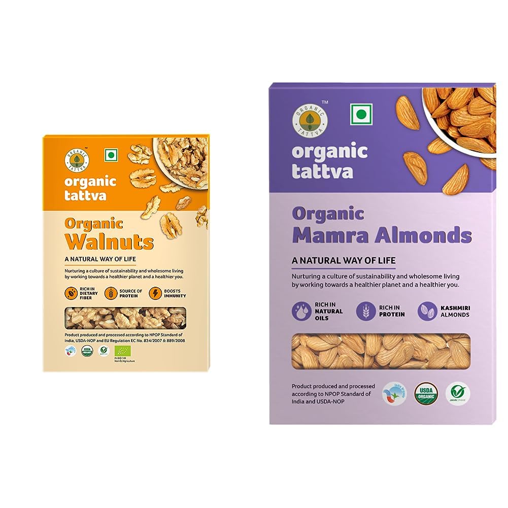 Organic Tattva Organic Walnuts (Akhrot Giri) 250 Gram | Rich in Dietary Fiber Protein and Antioxidants | NO Cholesterol and NO Trans-Fat | Boosts Immunity and Supports Nerve HealthWalnuts have been touted as the ââ¬Ëbrain foodââ¬â¢ because they resemble one with their furrowed appearance. The best thing is that consuming walnuts regularly actually good for brain or mind good for students. Easy to add to the diet they are very rich in nutritional content. They are better than most other nuts even almonds because they have a high amount of polyunsaturated fat vitamins and minerals like potassium iron zinc and magnesium. Fibre-rich and antioxidant rich walnuts trump all the other dry fruits on all accounts. Walnuts are deliciously healthy and great for snacking baking or cooking. These in shell raw walnut halves are mainly grown in California and northern India. Eating raw walnuts is one of the easiest things to do to boost your health. We bring you the taste and health together in single pack in the finest of packing packed in an art of the state facility certified by all majors like India organic USDA Organic Jaivik Bharat and FSSAI. Every Organic tattva pack is a perfect dry fruits gift for every festive occasion.Organic Tattva Organic Kashmiri Mamra Almonds/Badams 100 Gram(Pack of 1)One of the healthiest and most versatile of nuts the ALMOND is known for its several nutritional benefits and culinary uses. They are little powerhouses of Fiber Protein Vitamin E Antioxidants and Minerals. You can soak them roast them top off your cereals salads and yogurts with them or simply eat them raw! They are delicious in every way! Mamra Almonds are a wealthy source of minerals proteins and vitamins. Mamra Almonds are usually identifiable due to their short size and high nutritional profile and contains more oil content than any other almonds type. Mamra almonds accounts for roughly 5% of total global almond production and are hence considered as the premium variety of almonds in the world. This makes Mamra Badams very expensive as much as 3X times more than the regular almond varieties. Indian Mamra Almond contains a number of minerals vitamins proteins and carbohydrates that are necessary for the healthy functioning of the body. Mamra almond is a good source of healthy fat protein and fiber which help our body to burn calories easily and thus helps in increasing our metabolic rate. Organic Tattva's Mamra Almonds are certified organic and is purely from Kashmir and rich in natural oil and have better Taste than any other badam they have ever tasted.