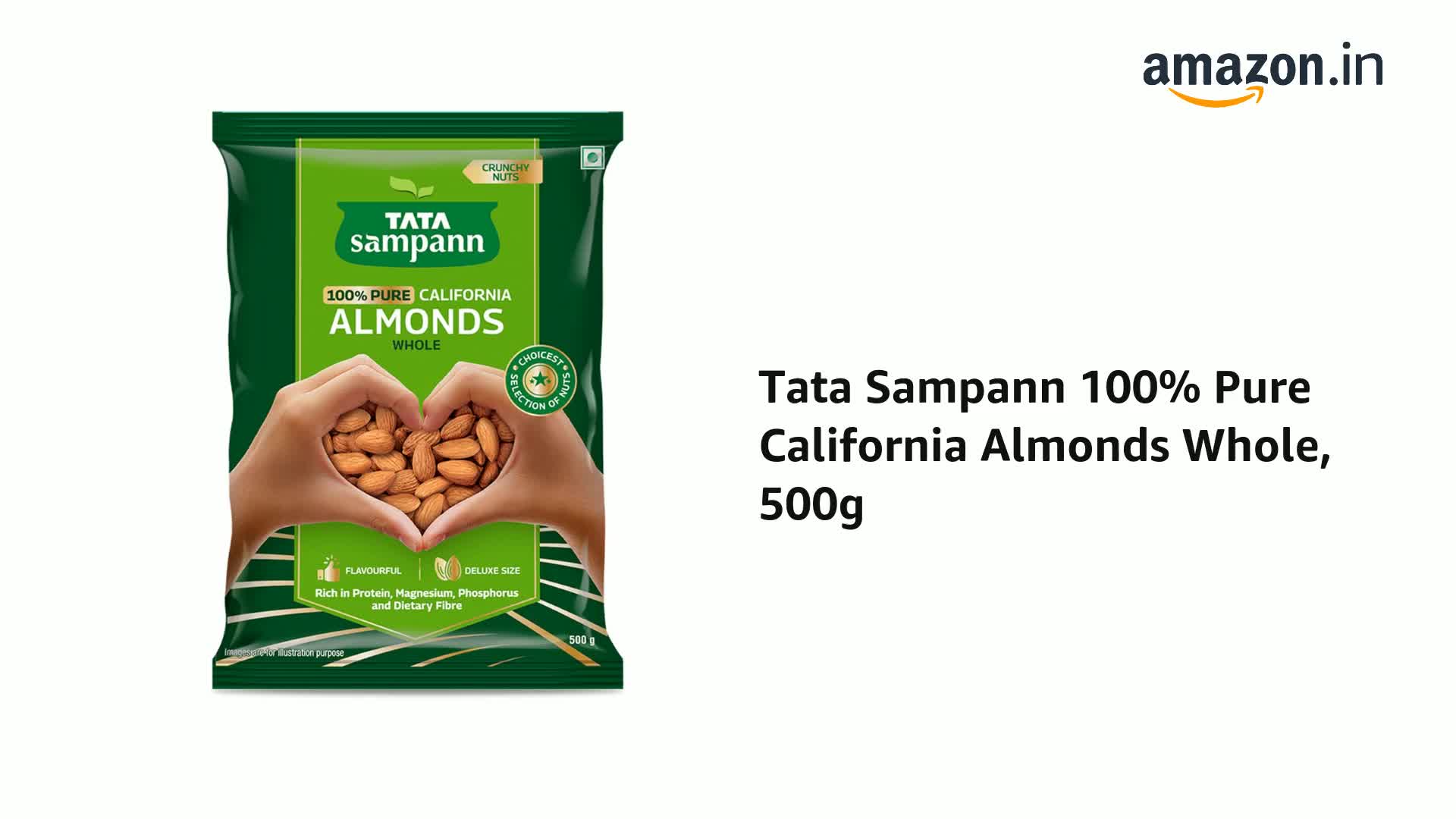 Introducing new â Tata Sampann California Almonds (Whole)! Each pack contains the choicest selection of handpicked nuts with a promise to consistently deliver premium quality. Enjoy 100% pure California Almonds that are crunchy flavourful and of uniform colour and deluxe size. As a consumer you seek freshness nutrition and quality in everything you buy. Premium packaging keeps goodness and quality intact ensuring crunch and great flavor. With Tata Sampann Almonds enjoy guilt-free indulgence always! Almonds are naturally rich in protein magnesium and phosphorus all of which contribute to the maintenance of bone health. They are also naturally rich in dietary fibre and are generally known to be a part of a healthy and balanced diet. Use it as a festive gift hamper as a nutty delight to greet your guests or simply snack on it whenever you want. Buy Tata Sampann 100% Pure California Almonds and other products in the range to bring happiness to your loved ones and yourself! Storage Instructions: Store in a cool and dry place. Transfer the contents to an airtight container after opening.