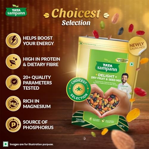 Snack On Power-Packed & Crunchy Dry Fruit & Seed Mix! Indulge in the irresistible delight of Tata Sampann Delight Dry Fruit & Seed Mix. Enjoy the delicious power-packed and crunchy snacking options for you. This mix of dry fruits & seeds undergo 20+ quality parameter checks to ensure you get only the premium quality. Snack on this delicious dry fruit and seed mix that is high in Protein & Dietary Fibre rich in Magnesium and a source of Phosphorus. The nuts and seeds mix consists of Roasted Almonds Cranberries Black Raisins Green Raisins Pumpkin Seeds Flax Seeds & Chia Seeds that help boost your energy. Enjoy this protein-rich snack for breakfast mid-day snacking or on-the-go snacking. Elevate your snacking game with Tata Sampann Delight Dry Fruit & Seed Mix today! Storage Instructions: Store in a cool and dry place. Store away from direct heat or sunlight.