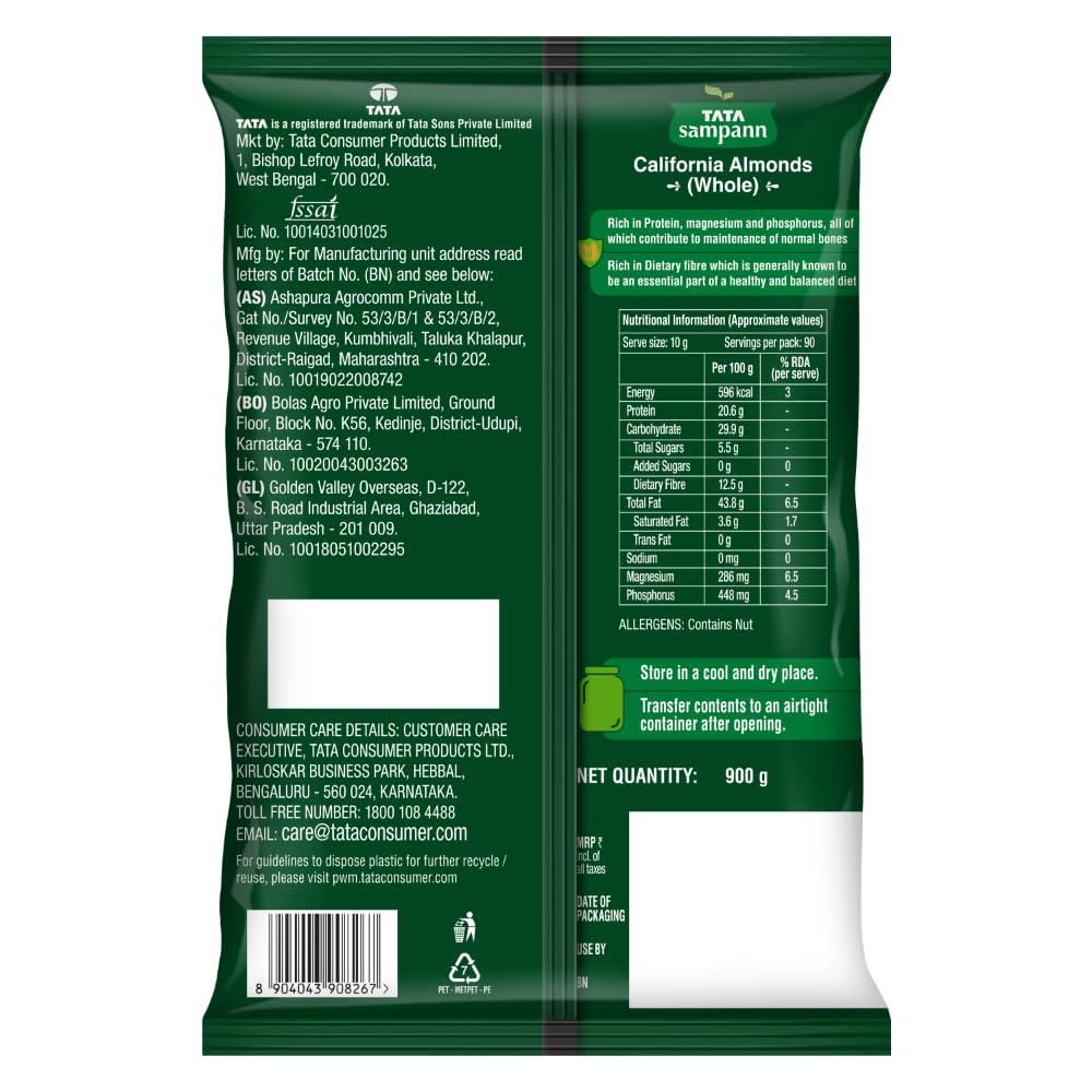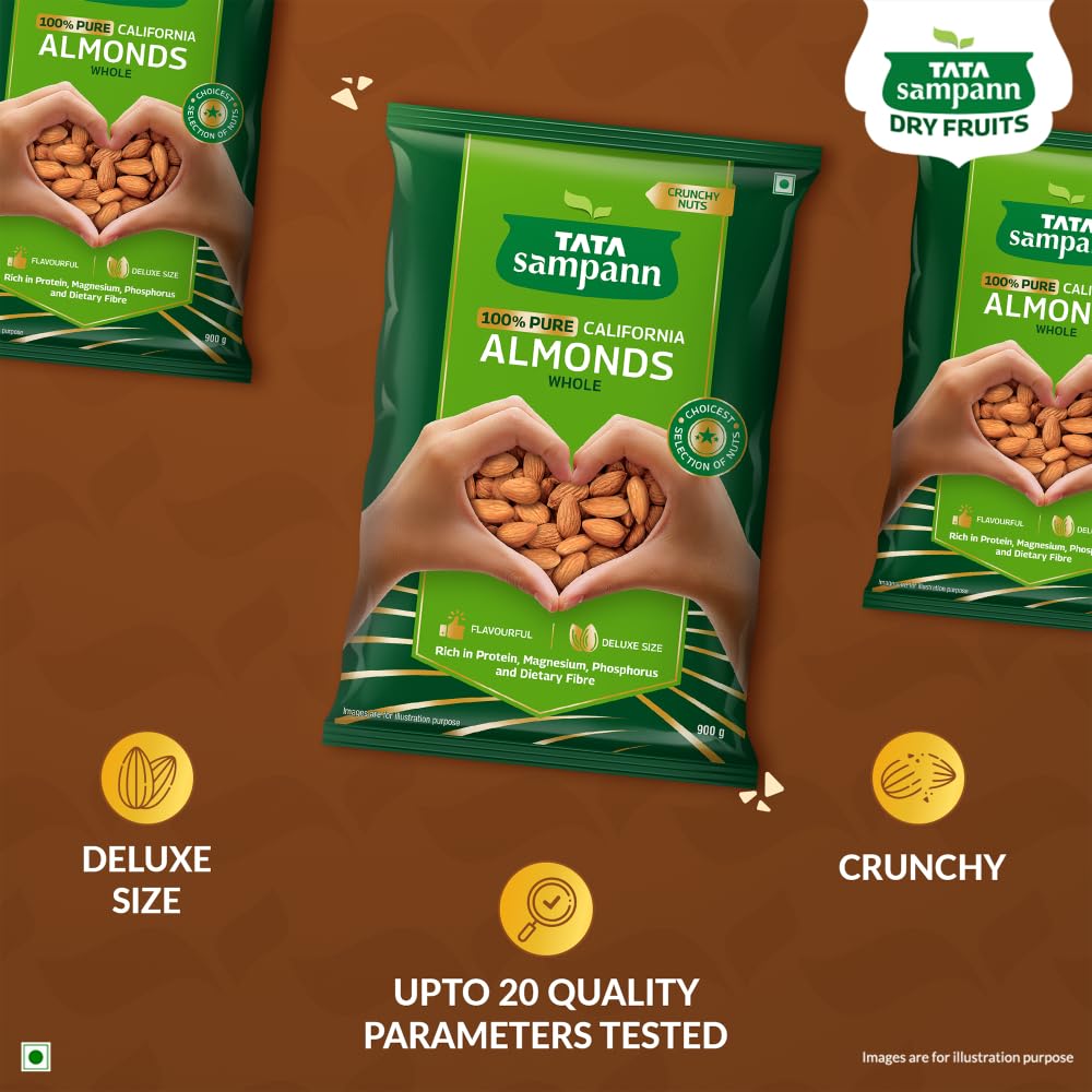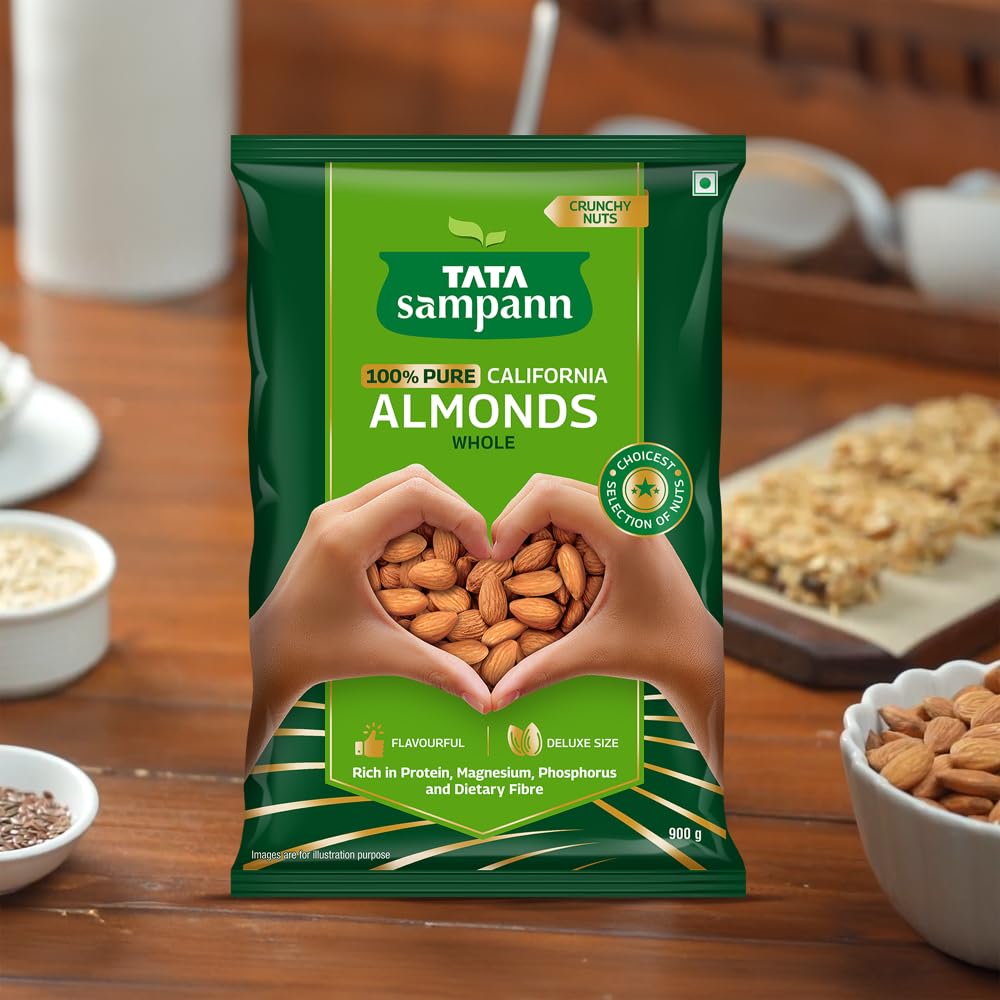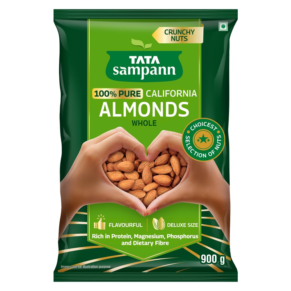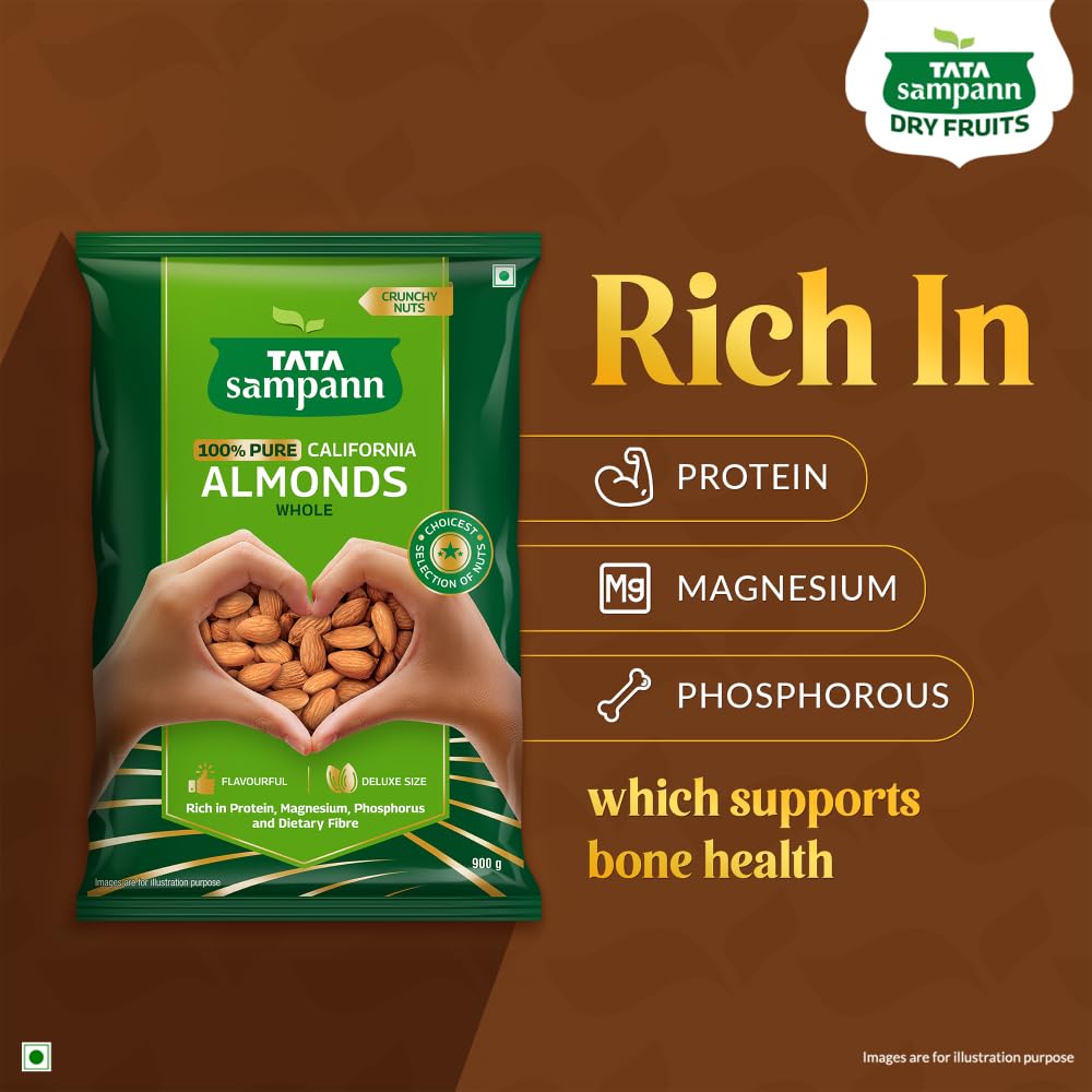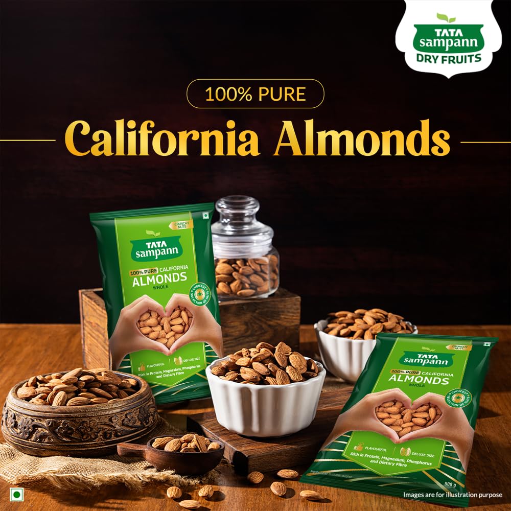 Tata Sampann 100% Pure California Almonds Tata Sampann brings you a whole range of premium dry fruits nuts and raisins for a wholesome snacking experience. With the choicest selection of nuts Tata Sampann 100% Pure California Almonds are grown and harvested in California. Tata Sampann dry fruits go through up to 20 quality parameters to deliver the choicest selection of nuts. Good choice for your well-being Packed with the goodness of protein magnesium phosphorus and dietary fibre Tata Sampann badam are a good choice for your well-being. They are rich in dietary fibre which is generally known to be an essential part of a healthy & balanced diet. Rich in protein magnesium and phosphorus all of which contribute to maintenance of normal bones. So satiate yourself guilt-free with this fulfilling snack or share it with your loved ones. Happy snacking! Turn your snack time delicious and wholesome with these crunchy and flavourful nuts. They are perfect to curb your hunger in between meals and make for a great addition to your diet. Add these almonds to your cooking practices and upgrade your favourite dishes to yummy delights.
