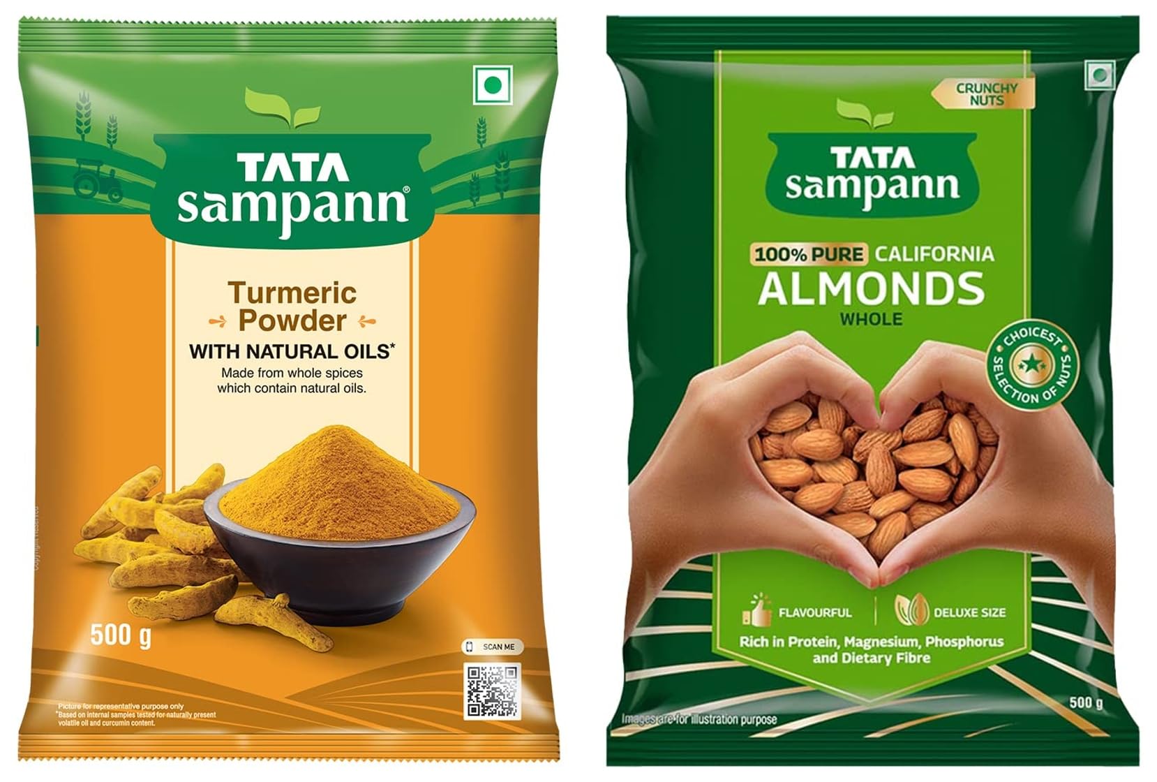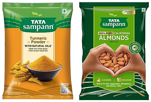 Tata Sampann Pure California Almonds Whole | Premium Badam Giri | Rich in Protein Magnesium Phosphorus and Dietary Fibre | Premium Nuts & Dry Fruits | 500gTata Sampann 100% Pure California Almonds Tata Sampann brings you a whole range of premium dry fruits nuts and raisins for a wholesome snacking experience. With the choicest selection of nuts Tata Sampann 100% Pure California Almonds are grown and harvested in California. Tata Sampann dry fruits go through up to 20 quality parameters to deliver the choicest selection of nuts. Good choice for your well-being Packed with the goodness of protein magnesium phosphorus and dietary fibre Tata Sampann badam are a good choice for your well-being. They are rich in dietary fibre which is generally known to be an essential part of a healthy & balanced diet. Rich in protein magnesium and phosphorus all of which contribute to maintenance of normal bones. So satiate yourself guilt-free with this fulfilling snack or share it with your loved ones. Happy snacking! Turn your snack time delicious and wholesome with these crunchy and flavourful nuts. They are perfect to curb your hunger in between meals and make for a great addition to your diet. Add these almonds to your cooking practices and upgrade your favourite dishes to yummy delights.Tata Sampann Turmeric Powder With Natural Oils 500gTata Sampann's range of spices are crafted not just to satisfy your taste buds but also to take care of your health. Made from whole spices that contain natural oils haldi has an active ingredient called curcumin. With no added preservatives this turmeric powder can be teamed up with pulao greenies vegetable soup or smoothies the choice is yours! Storage Instructions: Store in a cool and dry place.