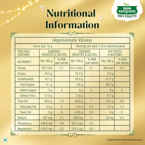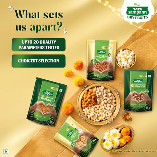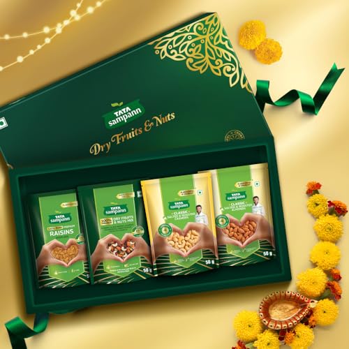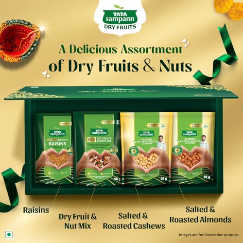 Elevate your gifting game with Tata Sampann Shagun! Introducing the choicest gift for all occasions the Tata Sampann Shagun assorted dry fruits gifting collection! Enjoy the delicious assortment of Tata Sampann Salted & Roasted Almonds Tata Sampann Salted & Roasted Cashews Tata Sampann Seedless Raisins and Tata Sampann Dry Fruits & Nuts Mix. Gifting made wholesome with this gift box of premium dry fruits & nuts collection with the choicest collection of handpicked dry fruits & nuts. The delicious and vibrant combo is the answer to your cravings for something wholesome as well as tasty. These dry fruits & nuts are source of dietary fibre. Tata Sampann Shagun is a choicest gift for festive celebrations corporate gifting and even as a hamper for family functions. Gift happiness with the choicest selection of quality nuts and dry fruits making this festive season brighter and auspicious. Let's make celebrations more special with Tata Sampann Shagun! Storage Instructions: Store in a cool and dry place. Transfer contents to an airtight container after opening.