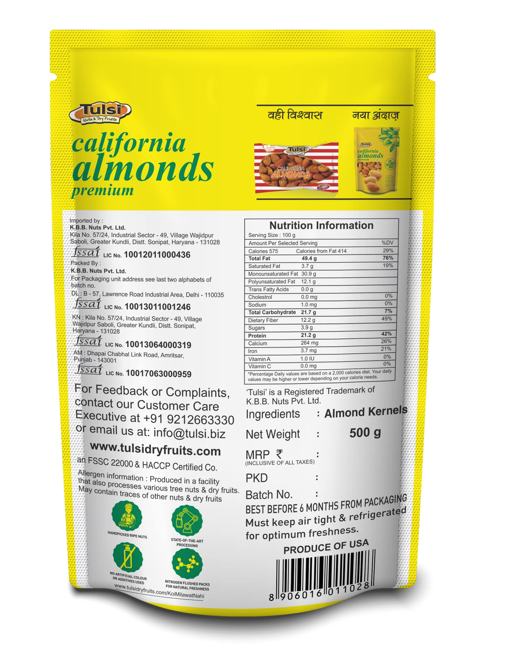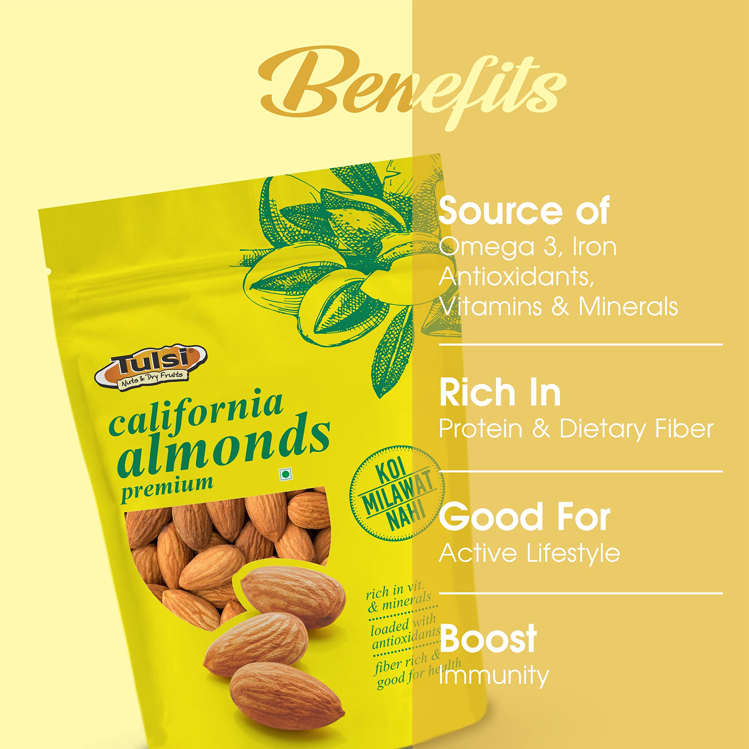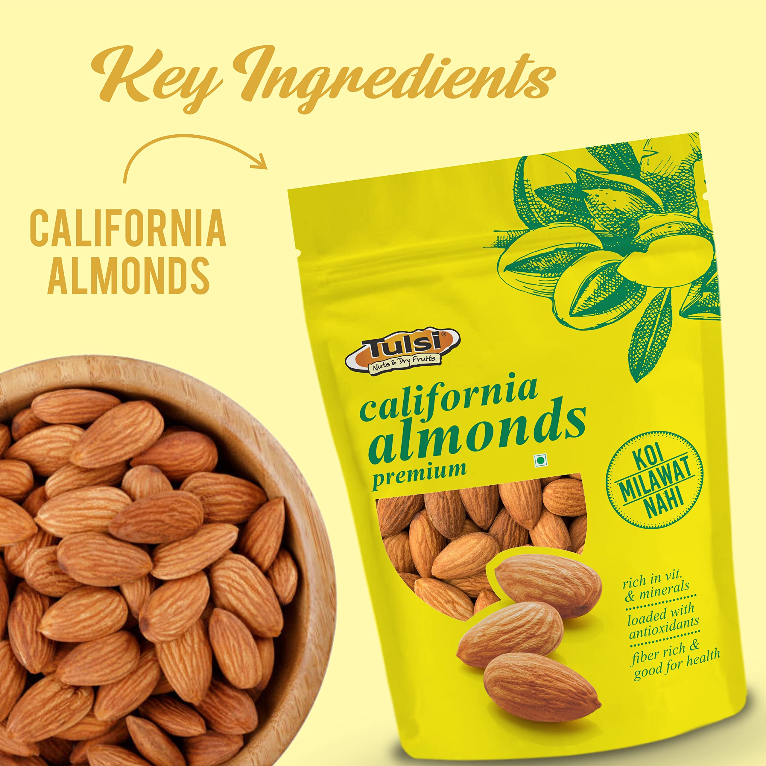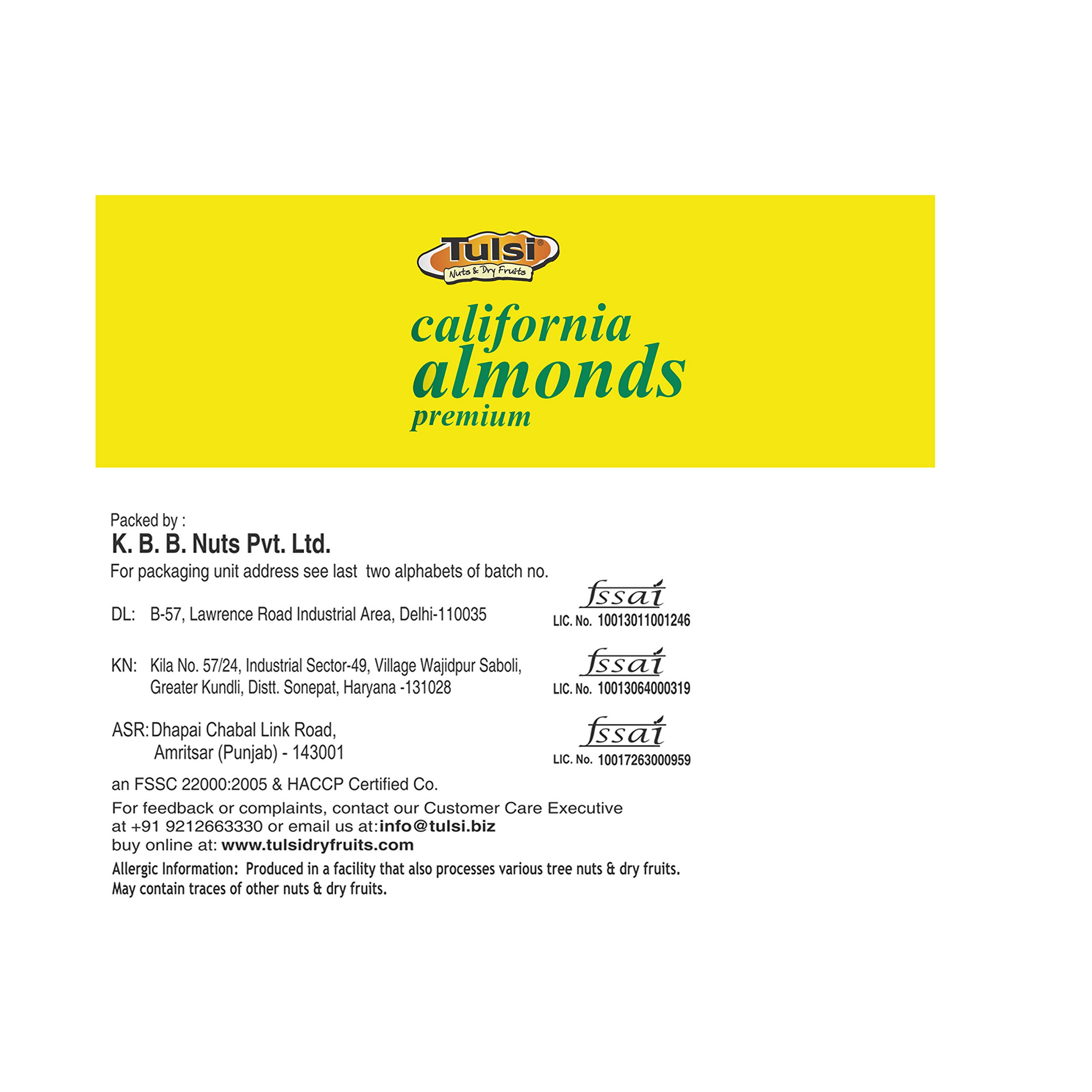 Tulsi California Almonds is one of the most nutritious of all nuts. It is a delicious nut which is crispy in taste acts as the best buddy in the morning breakfast and as an anytime snack. Almonds are a source of vitamin E copper magnesium and high-quality protein; they o contain high levels of healthy unsaturated fatty acids along with high levels of bioactive molecules (such as fiber sterols vitamins other minerand anti). Almonds are naturally -free and are a versatile nutrient-rich ition to -free diets. Tulsi is a premium nuts and dry fruits brand. Tulsi brings you the best and the most nutritious daily dose of healthy nuts and dry fruits. At Tulsi we bring the taste and health together in a single pack in the finest of packing. We believe in serving the best products to our customers and hence we travel across the world to prothe finest nuts and dry fruits. Our products are processed and packed in FSSC: 22000 & HACCP certified plant The best among food safety ratings and certified by FSSAI.