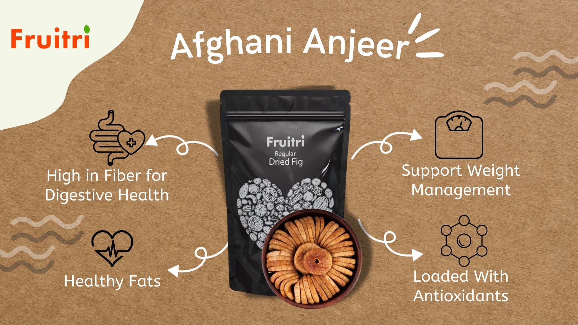 Enjoy the goodness of Fruitri Premium Anjeer (Dried Figs) a powerhouse of nutrition taste and health benefits. Sourced from the finest farms our fig dry fruit is naturally dried to preserve its rich flavor and essential nutrients. With no added sugar or preservatives these delicious and chewy figs are the perfect choice for a healthy lifestyle. Packed with fiber antioxidants vitamins and minerals anjeer supports digestion strengthens immunity and promotes heart health. Whether you choose Anjeer 250 gm Anjeer 500gm or Anjeer 1kg each pack is hygienically sealed to ensure maximum freshness and quality. Perfect for snacking adding to breakfast smoothies or desserts figs dry fruits 250g make a naturally sweet and nutritious addition to your diet. Make the switch to a healthier snack today with Fruitri Anjeer naturally delicious guilt-free and packed with benefits!