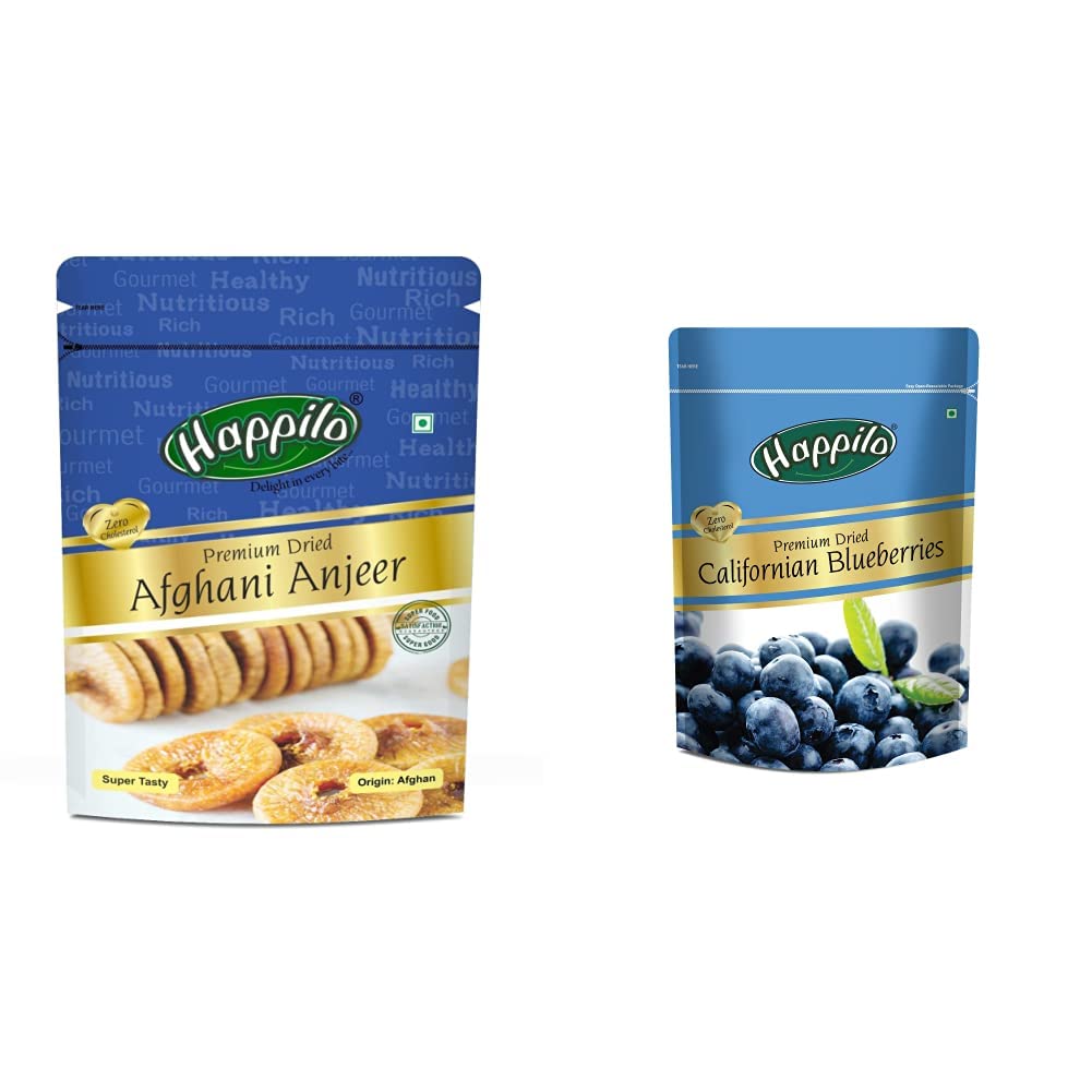 Happilo Premium Afghani Anjeer 200gAfghani anjeer known for their creamy sweet and indulgent taste- They are also packed with nutritional goodness making them one of the healthiest dried fruit. Eating these amazing snack can keep the hunger pangs at bay.Happilo Premium Dried Californian Blueberries 150gBlueberries are slightly sweetened and ideal for snacking mixing in cereals or adding to cakes and muffins. Heart Healthy plump and sweet taste of our dried blueberries will leave your taste buds in paradise.