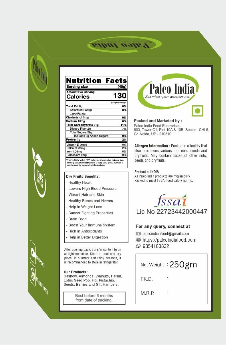 Paleo India Jumbo Size Figs or Anjeer are loaded with health benefits and are incredibly versatile. Common Fig popularly known as Anjeer, is a delicious dry fruit. Unlike other dry fruits, Anjeer has a soft juicy outer coating and crunchy seeds inside, which makes it an amazing fruit to relish.Consuming soaked anjeer first thing in the morning helps you stay full for longer and prevents any cravings through the day, further helping you prevent weight gain (foods to avoid for weight loss). Figs are rich in fiber which takes time to digest and prevents you from consuming more calories. Paleo India bring the taste and health together in a single pack. We believe in serving the best products to our customers. Our products are processed and packed properly with proper hygiene taking care of our customers expectations.