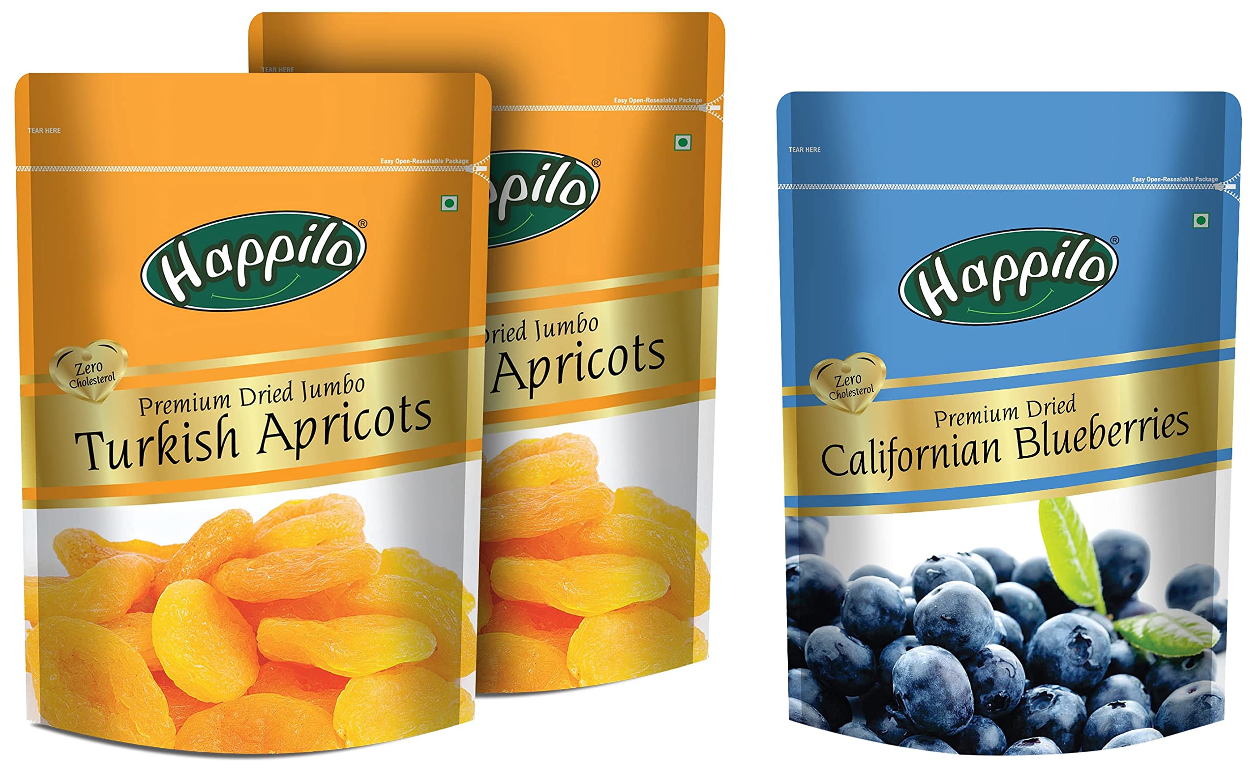 Happilo Premium Dried Californian Blueberries 150 g (Pack of 1)Happilo has travelled the world to get the finest gourmet dry fruits Dried Blueberries are the original candy- nature's candy. They are one of the most nutritious dried fruits in the world. famous for their sweetness so they're a yummy healthy snack. They have double the deliciousness of ordinary dried blueberries. Great for Snacking adding to Cereal Cooking and Baking. High Antioxidants Dietary Fiber No Gluten Non GMO Zero Trans Fat & Zero Cholesterol. Daily need products for a healthy and energetic life. Happilo Zip Lock Pouch with airtight seal to ensure the product is protected and fresh. Quality assured - Happilo products are rigorously tested against the industry's best quality standards.Happilo Premium Jumbo Turkish Apricots 200g (Pack of 2)Happilo has travelled the world to get the finest gourmet dry fruits. They are one of the most nutritious dried fruits in the world they're a yummy healthy snack. Great for Snacking adding to Cereal Cooking and Baking. High Antioxidants Dietary Fiber No Gluten Non GMO Zero Trans Fat & Zero Cholesterol. Daily need products for a healthy and energetic life. Happilo Zip Lock Pouch with airtight seal to ensure the product is protected and fresh. Quality assured - Happilo products are rigorously tested against the industry's best quality standards.