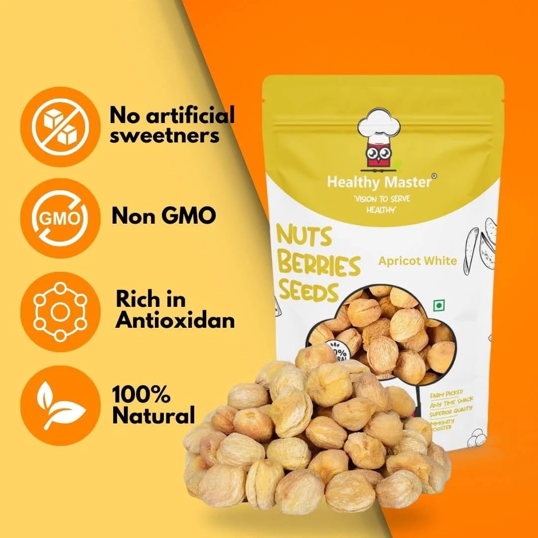 Healthy Master's Apricot White is a premium variety of dried apricots that offer a naturally sweet tangy flavor combined with a host of health benefits. These apricots are carefully harvested sun-dried and packed to preserve their rich nutrients and delicate taste. Known for being rich in vitamins antioxidants and fiber Apricot White helps improve digestion boost immunity and promote glowing skin. A versatile addition to your pantry they can be eaten on their own as a snack added to smoothies or incorporated into baked goods for a nutritious and delicious boost.