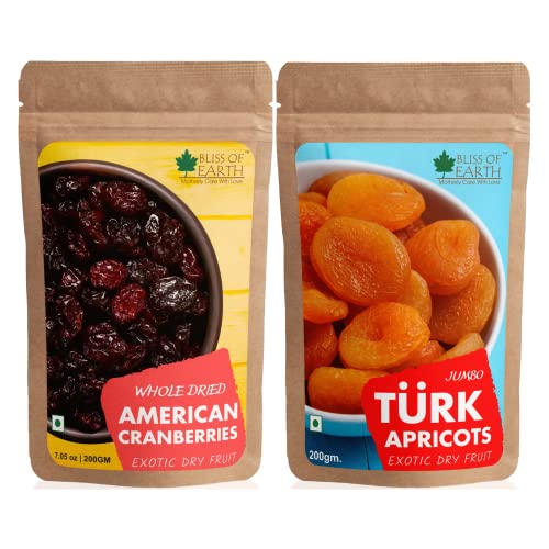 Bliss of Earth Dried Whole Cranberries are handpicked from the United States of America. These berries are natural and delightful dried berries that an excellent source of antioxidants Also rich in vitamin K&c and fiebre cranberries offer a daily dose of nutrients. Unlike many other dry fruits these berries are extremely versatile in their use. Dried cranberries are a culinary ingredient that will help you produce a variety of great dishes.Bliss of Earth Jumbo Dried Apricots are handpicked from Turkey. these are naturally a good source of potassium fiber and Vitamin A & E. Dried apricots make for a quick delicious snack and an easy addition to your favourite meal.