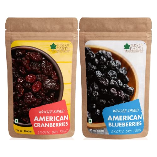 Bliss of Earth Dried Whole Cranberries are handpicked from the United States of America. These berries are natural and delightful dried berries that an excellent source of antioxidants Also rich in vitamin K&c and fiebre cranberries offer a daily dose of nutrients. Unlike many other dry fruits these berries are extremely versatile in their use. Dried cranberries are a culinary ingredient that will help you produce a variety of great dishes.Bliss of Earth Dried Whole Blueberries are handpicked form he United States of America.These berries are natural and delightful dried berries having a sweet flavour and they are succulent & nutritious Blueberries are rich in a flavonoid called "anthocyanin" which has many health benefits. Unlike many other dry fruits these berries are extremely versatile in their use. Dried Blueberries are culinary ingredient that will help you produce a variety of great dishes.