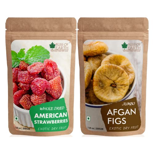 Bliss of Earth Dried Strawberries are handpicked from the United States of America. These berries are natural and delightful dried berries that are an excellent source of antioxidants. Also rich in vitamin A & C and fibre Strawberries offer anti-inflammatory properties helping in muscle recovery. Unlike many other dry fruits these berries are extremely versatile in their use. Dried strawberries are a culinary ingredient that will help you produce a variety of great dishes.Bliss of Earth Dried Figs are in jumbo size and handpicked from afghanistan .These figs are low on calories and are immensely rich in soluble dietary fibre essential nutrients and a host of plant compounds that contribute to healing health benefits. figs are a powerhouse of antioxidant flavonoids which include carotenes lutein tannins chlorogenic acids and vitamins A E and K which assists in scavenging free radicals and prevents a host of chronic disease and reduces inflammation