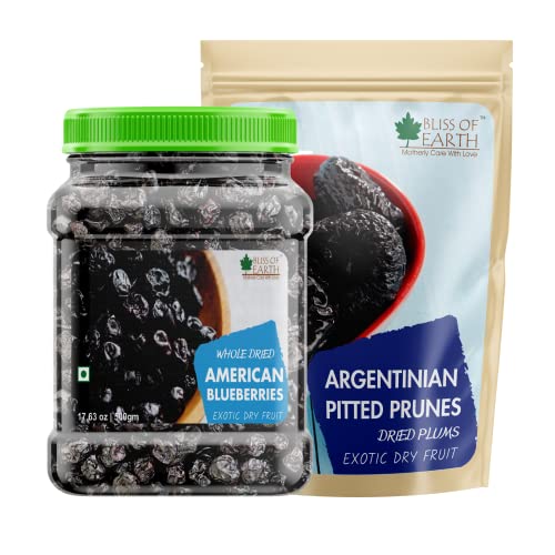 Bliss of Earth Pitted prunes are packed with fiber and are a powerhouse of vitamins and minerals including Potassium iron and retinol. Prunes are rich in vitamin k and contain beta-carotene. Adding them to your daily diet can provide you with a plethora of health benefits.Bliss of Earth Dried Whole Blueberries are handpicked form he United States of America.These berries are natural and delightful dried berries having a sweet flavour and they are succulent & nutritious Blueberries are rich in a flavonoid called "anthocyanin" which has many health benefits. Unlike many other dry fruits these berries are extremely versatile in their use. Dried Blueberries are culinary ingredient that will help you produce a variety of great dishes.