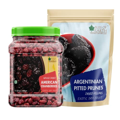 Bliss of Earth Pitted prunes are packed with fiber and are a powerhouse of vitamins and minerals including Potassium iron and retinol. Prunes are rich in vitamin k and contain beta-carotene. Adding them to your daily diet can provide you with a plethora of health benefits.Bliss of Earth Dried Whole Cranberries are handpicked from the United States of America. These berries are natural and delightful dried berries that an excellent source of antioxidants Also rich in vitamin K&c and fiebre cranberries offer a daily dose of nutrients. Unlike many other dry fruits these berries are extremely versatile in their use. Dried cranberries are a culinary ingredient that will help you produce a variety of great dishes.