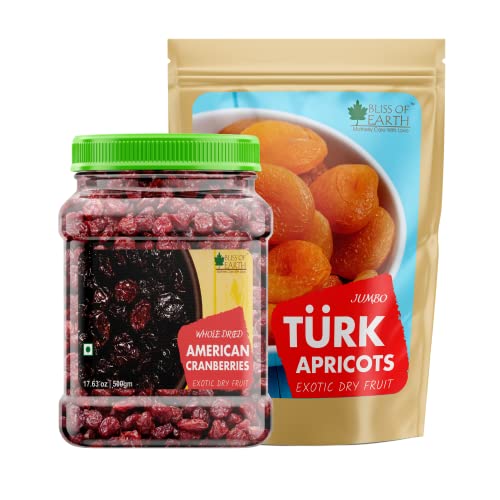 Bliss of Earth Dried Whole Cranberries are handpicked from the United States of America. These berries are natural and delightful dried berries that an excellent source of antioxidants Also rich in vitamin K&c and fiebre cranberries offer a daily dose of nutrients. Unlike many other dry fruits these berries are extremely versatile in their use. Dried cranberries are a culinary ingredient that will help you produce a variety of great dishes.Bliss of Earth Jumbo Dried Apricots are handpicked from Turkey. these are naturally a good source of potassium fiber and Vitamin A & E. Dried apricots make for a quick delicious snack and an easy addition to your favourite meal.