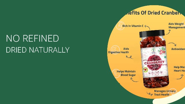 The natural goodness of premium Dried Cranberries carefully selected and sweetened to perfection. These chewy antioxidant-rich cranberries are not only a delicious snack but also a versatile ingredient for a variety of recipes. Whether you're baking your favorite treats adding a tangy twist to salads or blending them into smoothies these dried cranberries enhance every dish. Packed with essential nutrients and antioxidants they are a healthy snack choice that supports your active lifestyle. Conveniently jar-packed for freshness and ease of use they are perfect for gifting on special occasions or treating yourself to a wholesome delight.