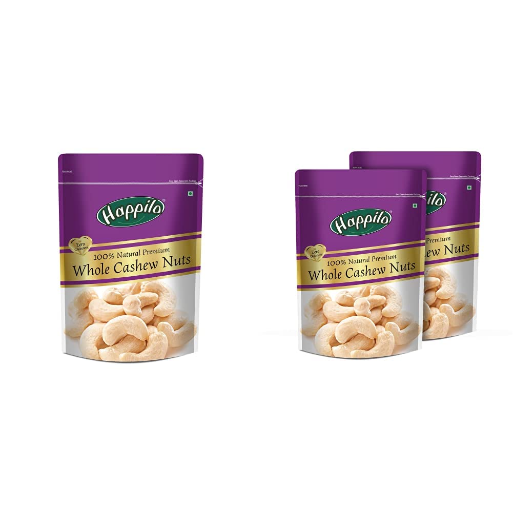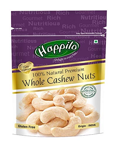 Happilo 100% Natural Premium Whole Cashews 200gOur cashews are a real treat. These are the best nuts you can ever find. They are delightfully rich and tasty a nutritious treat that will make a great snack time.Happilo 100% Natural Premium Whole Cashews 200g (Pack of 2)Happily has travelled the world to get the finest gourmet dry fruits dried fruits nuts berries and dates 100 percent natural and authentic. Indulge into the gourmet and grocery world of Happily with awesome natural nuts and dry fruits along with the unique dry fruit mixes fusions and flavoured dry fruits healthy seeds and dried berries specially crafted for your taste and health. Happily dry fruit gift boxes and festive dry fruits and nuts gift pack brings health happiness and love to gift to your colleagues friends and family. We bring you the taste and health together in single pack in the finest of packing packed in an art of the state facility certified by all majors like fssai iso. Every Happily pack is a perfect dry fruits gift for every festive occasion.