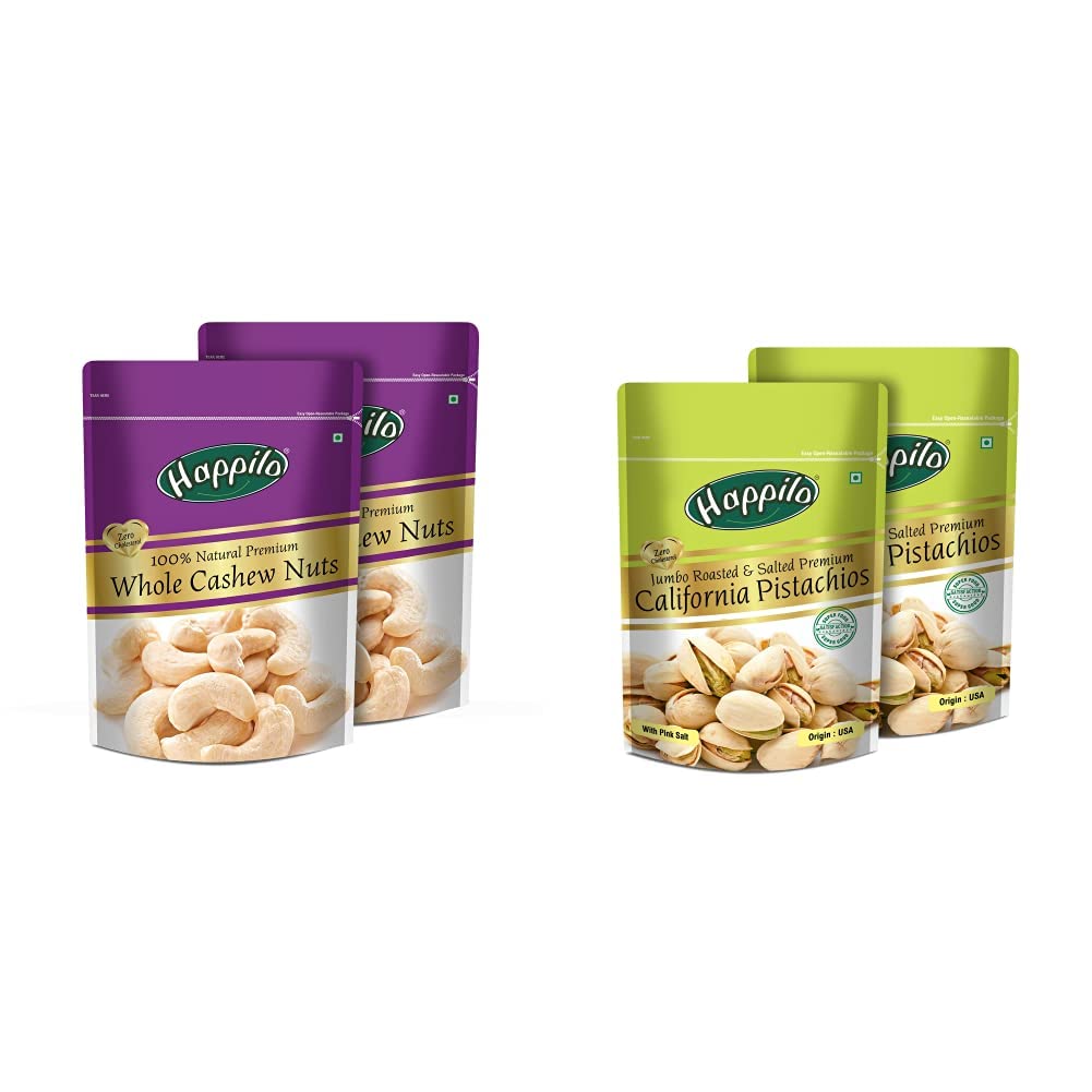 Happilo 100% Natural Premium Whole Cashews 200g (Pack of 2)Happily has travelled the world to get the finest gourmet dry fruits dried fruits nuts berries and dates 100 percent natural and authentic. Indulge into the gourmet and grocery world of Happily with awesome natural nuts and dry fruits along with the unique dry fruit mixes fusions and flavoured dry fruits healthy seeds and dried berries specially crafted for your taste and health. Happily dry fruit gift boxes and festive dry fruits and nuts gift pack brings health happiness and love to gift to your colleagues friends and family. We bring you the taste and health together in single pack in the finest of packing packed in an art of the state facility certified by all majors like fssai iso. Every Happily pack is a perfect dry fruits gift for every festive occasion.Happilo Premium Californian Roasted and Salted Pistachios 200g (Pack of 2)Happily has travelled the world to get the finest gourmet dry fruits dried fruits nuts berries and dates 100 percent natural and authentic. Indulge into the gourmet and grocery world of Happily with awesome natural nuts and dry fruits along with the unique dry fruit mixes fusions and flavoured dry fruits healthy seeds and dried berries specially crafted for your taste and health. Happily dry fruit gift boxes and festive dry fruits and nuts gift pack brings health happiness and love to gift to your colleagues friends and family. We bring you the taste and health together in single pack in the finest of packing packed in an art of the state facility certified by all majors like fssai iso. Every Happily pack is a perfect dry fruits gift for every festive occasion.
