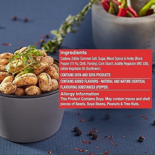 Devour in the unique combination of flavourful Crack Pepper & Herbs in delicious Premium Roasted Cashews. Cashew Pepper and Herbs Pack of 10 x 25g is week full of Nutrition. Benefits: Rich in Fibre Rich in Protein Cholesterol-free Premium Quality