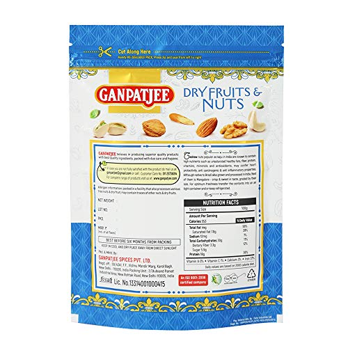 About GanpatjeeGanpatjee believes in superior quality products with the best quality ingredients packed with due care and hygiene.Whole Cashew Medium 250 gmCashews have a great number of antioxidants vitamins and minerals and bring down the bad cholesterol blood levels. Perfectly picked shelled and packaged for your salty savoury satisfaction each batch provides an incredible range of health benefits. Snack to your daily routine as our cashew nuts (Kaju) fills you with powerful energy and immune-boosting antioxidants and vitamins. Excellent sourcefor healthy diet. Suitable for vegetarian vegan raw diets and good for weight control and many recipes.Product Specifications:Product:Whole Cashew MediumQuantity: 250 GramIngredients: CashewsProduct FeaturesThis masala chai is an instant immunity booster for your healthVegetarian Product! No Artificial colours and No additivesPackage Includes:1* Whole Cashew Medium250 Gram