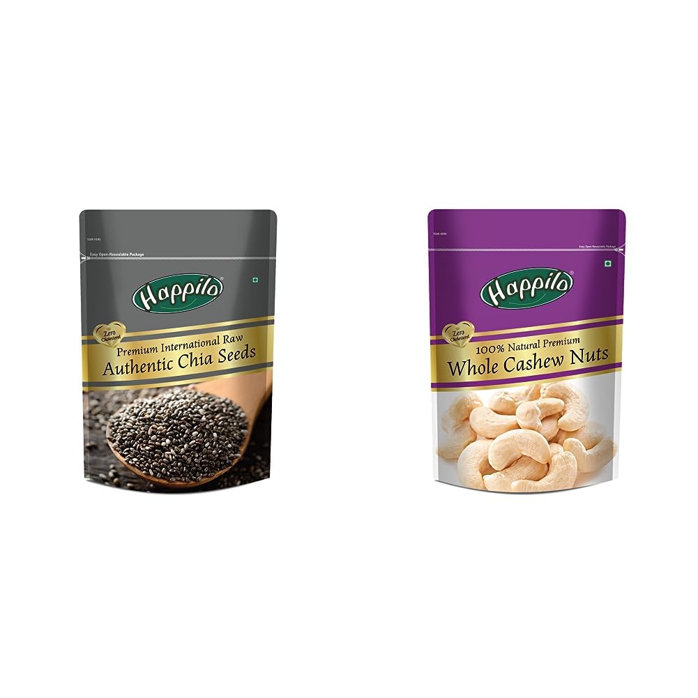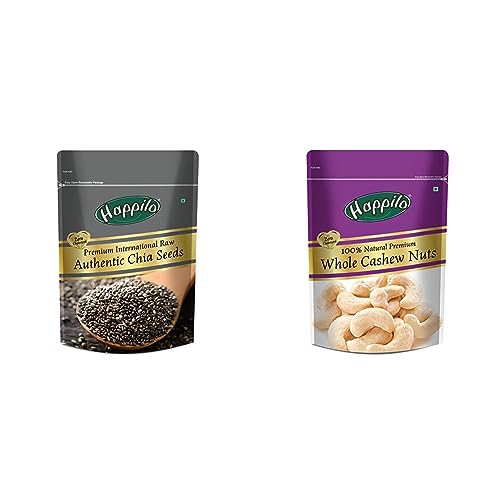 Happilo Premium Authentic Chia Seeds 250g Diet Food for Weight Management Rich in Fiber and Omega 3 Healthy Breakfast SnackA traditionally native to south America organic non-GMO chia seeds pack a powerful superfood punch. These small crunchy gluten-free seeds are a rich source of protein beneficial antioxidants essential omega-3 fatty acids and wholesome fibre. a brand that is committed to improving the of your life Happilo provides food that is packed with the goodness of nature and taste that will keep you wanting for more. With a range of food items across categories like dry fruits nuts seeds berries nut mixes and other healthy items each of our products is not only natural but is also made of whole grains. While we stand strongly for health wherein our products have a clear functional benefit we believe that taste is the most important element when it comes to snacks. We strive to bring the best range of snacks to you. Healthy snacking with Happilo dry fruits nuts seeds berries & nut mixes.Happilo 100% Natural Premium Whole Cashews 200 g (Pack of 1)Happilo has travelled the world to get the finest gourmet dry fruits Cashews are a real treat. These are the best nuts you can ever find. They are delightfully rich and tasty a nutritious treat that will make a great snack time.