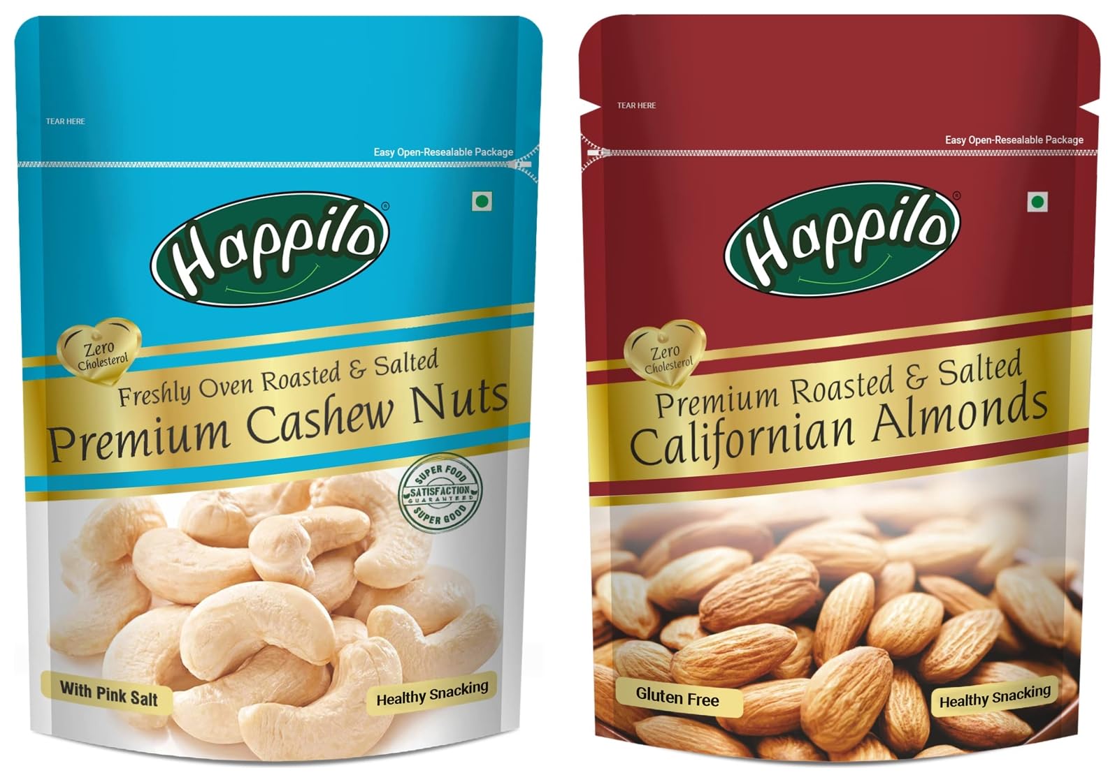 Happilo Premium Roasted and Salted Cashews 200 g | Freshly Oven Roasted | Premium Kaju nuts | Nutritious Crunchy & Delicious | Gluten Free | Plant-Based ProteinHappilo Has Travelled The World To Get The Finest Gourmet Dry Fruits Perfect For A Healthy Lifestyle.Time To Be Happy Lovely & Healthy.High Protein Dietary Fiber No Gluten No Gmo Zero Transfat Zero Cholesterol 100% Real Nuts- Good For An Active Lifestyle Lowers Harmful Cholesterol Levels Rich Source Of Omega-3 Anti Oxidants & Vitamins Calcium Iron & Magnesium. Shelf Life : 12 MonthsHappilo Premium Californian Almonds Roasted & Salted 200 g | Badam Dry Fruit | High Protein Snack & Super Healthy Crunchy Nuts | Vitamins & Minerals Rich | Freshly Roasted and Lightly SaltedHappilo has travelled the world to get the finest gourmet dry fruits dried fruits nuts berries and dates. Indulge into the gourmet and grocery world of Happily with awesome natural nuts and dry fruits along with the unique dry fruit mixes fusions and flavoured dry fruits healthy seeds and dried berries specially crafted for your taste and health.