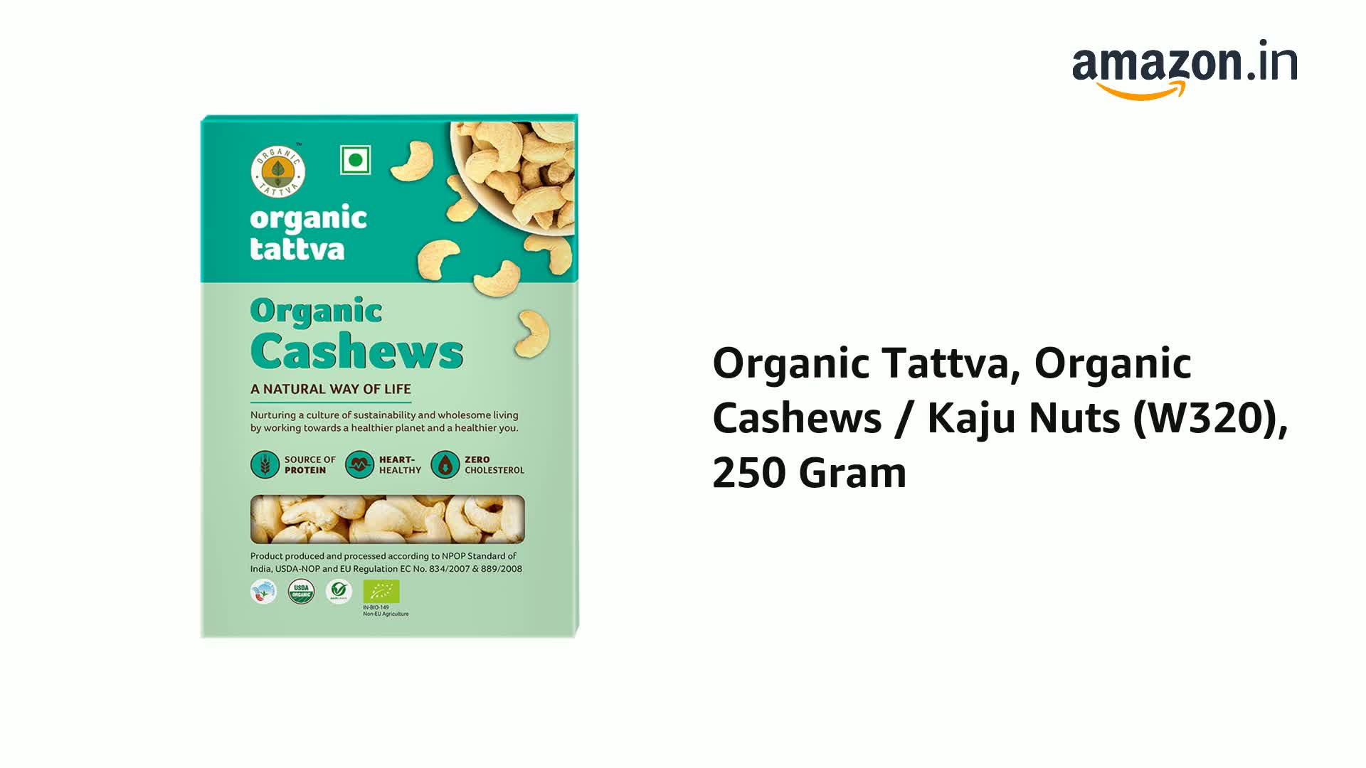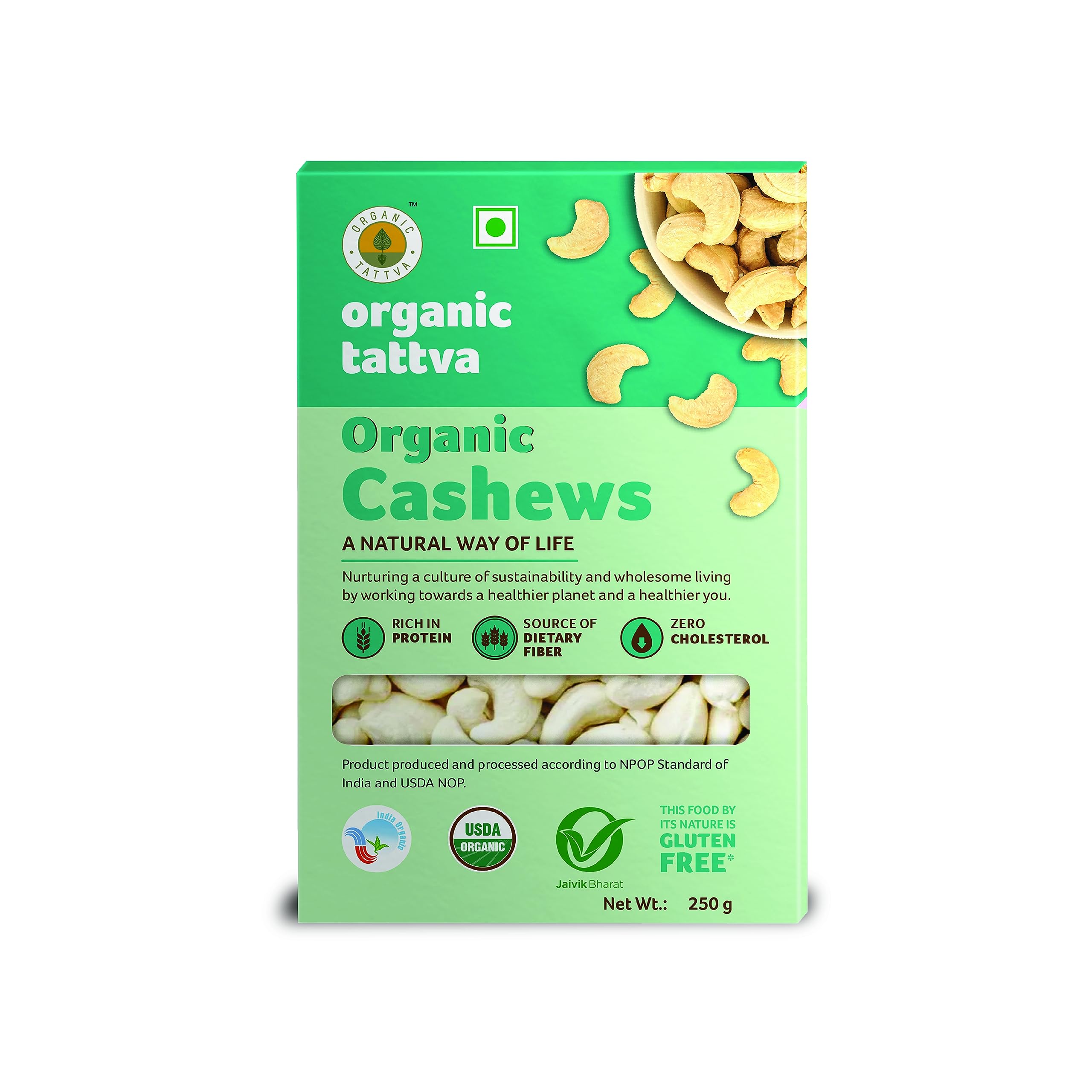Organic Tattva's Organic Cashew Nuts are rich source of calcium iron protein and dietary fiber. They are big in size and have a mild nutty taste so can be eaten raw or used as an ingredient in curries. One serving of Organic Cashew contains 0g trans-fat and 0mg cholesterol. The calorie count per 100g of Organic Cashew is 647. Organic Tattva Organic Cashew nuts are appetizing Cashew nut kernels can be used while cooking as a yummy topper in biryani desserts shakes smoothies etc and can be a part of your daily munching routine. With their unmistakable shape and delicious flavor cashew nuts are store to minerals like copper phosphorus zinc magnesium and iron which are essential for basic functionality of human body. Organic Tattva Cashew Nuts Kernels W320 grade are big in size with their naturally delicious buttery-sweet flavor and are packed with vitamin E & B-6 that help fight against cardiovascular diseases. If living a healthy life is your aim then add Organic Cashew by Organic Tattva in your diet today!