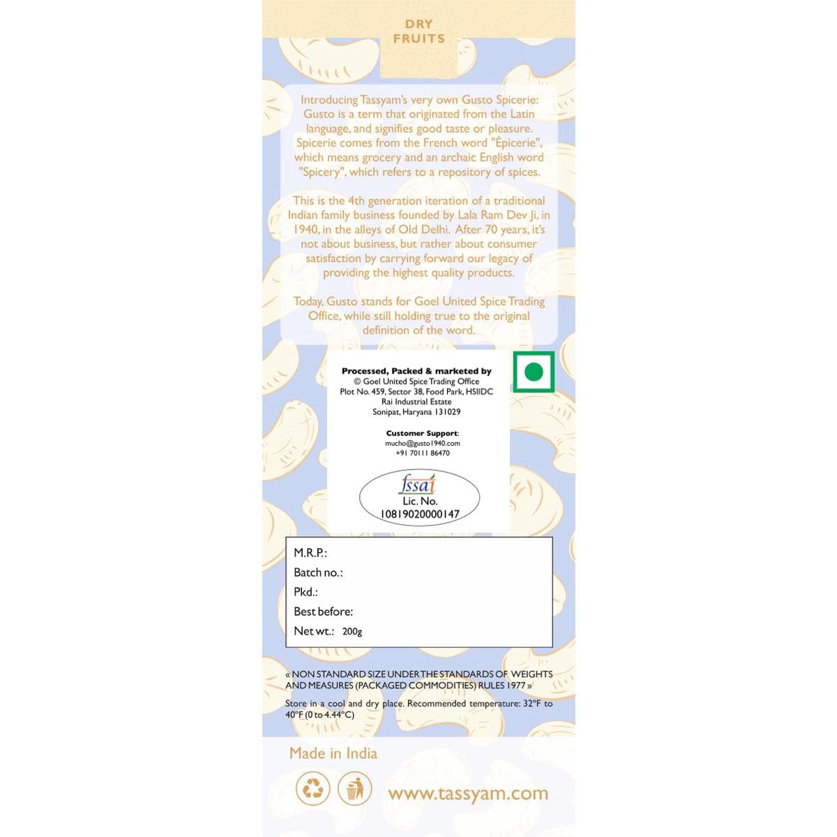 Tassyam Premium (Mangalore W240) Cashews 200g Kaju | Healthy Dry Fruits Luxury Box