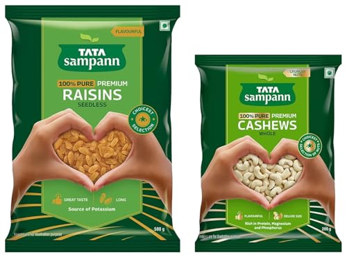Tata Sampann Pure Cashews Whole | Premium Kaju | Rich in Protein Magnesium and Phosphorus | Premium Nuts & Dry Fruits | 200gTata Sampann 100% Pure Premium Cashews Tata Sampann brings you a whole range of premium dry fruits nuts and raisins for a wholesome snacking experience. Made from the choicest selection of nuts Tata Sampann 100% Pure Premium Cashews are worth savouring. Tata Sampann dry fruits go through up to 20 quality parameters to deliver the choicest selection of nuts. Good choice for your well-being Packed with the goodness of protein magnesium and phosphorus Tata Sampann kaju are a good choice for your well-being. Rich in protein magnesium and phosphorus all of which contribute to maintenance of normal bones. So satiate yourself guilt-free with this fulfilling snack or share it with your loved ones. Happy snacking! Turn your snack time delicious and wholesome with these crunchy and flavourful nuts. They are perfect to curb your hunger in between meals and make for a great addition to your diet. Add these cashews to your cooking practices and upgrade your favourite dishes to yummy delights. Tata Sampann Pure Raisins Seedless | Premium Kishmish | Source of Potassium | Premium Dry Fruits | 500g Value PackTata Sampann 100% Pure Premium Raisins Tata Sampann brings you a whole range of premium dry fruits nuts and raisins for a wholesome snacking experience. Made from the choicest selection Tata Sampann 100% Pure Premium Raisins are worth savouring. Tata Sampann dry fruits go through up to 20 quality parameters to deliver the choicest selection of nuts and raisins. Good choice for your well-being Packed with the goodness of potassium Tata Sampann kishmish are a good choice for your well-being. Tata Sampann raisins are a source of potassium which is known to contribute to the maintenance of normal blood pressure. So satiate yourself guilt-free with this fulfilling snack or share it with your loved ones. Happy snacking! Turn your snack time delicious and wholesome with these flavourful raisins. They are perfect to curb your hunger in between meals and make for a great addition to your diet. Add these raisins to your cooking practices and upgrade your favourite dishes to yummy delights.