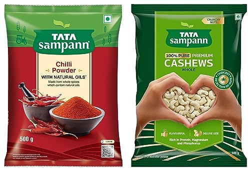 Tata Sampann Pure Cashews Whole | Premium Kaju | Rich in Protein Magnesium and Phosphorus | Premium Nuts & Dry Fruits | 500gTata Sampann 100% Pure Premium Cashews Tata Sampann brings you a whole range of premium dry fruits nuts and raisins for a wholesome snacking experience. Made from the choicest selection of nuts Tata Sampann 100% Pure Premium Cashews are worth savouring. Tata Sampann dry fruits go through up to 20 quality parameters to deliver the choicest selection of nuts. Good choice for your well-being Packed with the goodness of protein magnesium and phosphorus Tata Sampann kaju are a good choice for your well-being. Rich in protein magnesium and phosphorus all of which contribute to maintenance of normal bones. So satiate yourself guilt-free with this fulfilling snack or share it with your loved ones. Happy snacking! Turn your snack time delicious and wholesome with these crunchy and flavourful nuts. They are perfect to curb your hunger in between meals and make for a great addition to your diet. Add these cashews to your cooking practices and upgrade your favourite dishes to yummy delights. Tata Sampann Chilli Powder With Natural Oils 500gTata Sampann's range of spices are crafted not just to satisfy your taste buds but also to take care of your health. Made from whole spices that contain natural oils red chilli has an active ingredient called capsaicin. With no added preservatives this chilli powder can be teamed up with pulao greenies baked corn or pasta the choice is yours! Storage Instructions: Store in a cool and dry place.