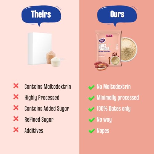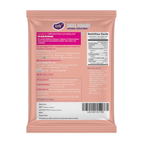 Nutrition facts: - Its 100% Dried Dates Powder. Rich in iron & dietary fibre. - Makes best natural sweetener for baby and sugar replacement who avoid refined sugar till the age of 1 Yr - Also for adults who are looking for a healthy sugar replacement - No Preservatives colours or artificial flavours used How to use: Just add 1-2 teaspoons of the Dates Powder to naturally sweeten your babys meal like porridges kheer sheera dosa etc. and make it not only tasty but healthy too! Ingredients: Dried Dates. No added sugar or salt. No preservatives colours or artificial flavours. Shelf Life: Best before 4 months from MFD. Best to store in a dry steel or glass container in a refrigerator.