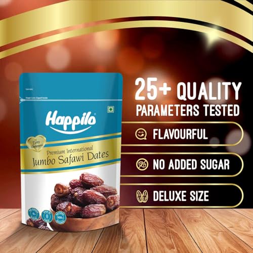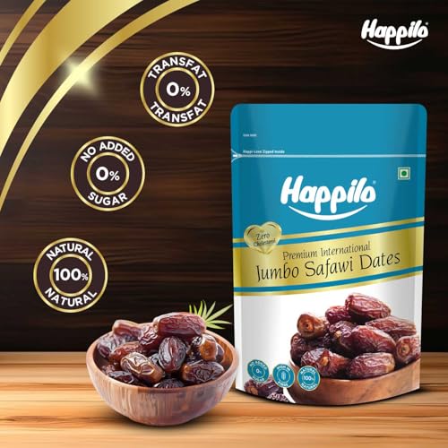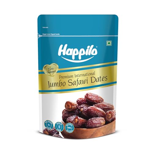 Indulge in the rich and distinct flavor of Happilo Safawi Jumbo Dates (200g). Sourced for their premium quality these dates are renowned for their dark color and chewy texture. The jumbo-sized 200g pack ensures you have an ample supply of these exquisite Safawi dates for your snacking pleasure. Packed with natural sweetness and essential nutrients these dates offer a wholesome and nutritious option for those seeking a satisfying snack. With Happilo's commitment to quality assurance each Safawi date in the pack undergoes stringent checks guaranteeing a consistently delightful and premium snacking experience. Elevate your snacking routine with Happilo Safawi Jumbo Dates where every bite is a taste of indulgence and natural goodness.