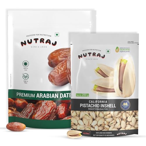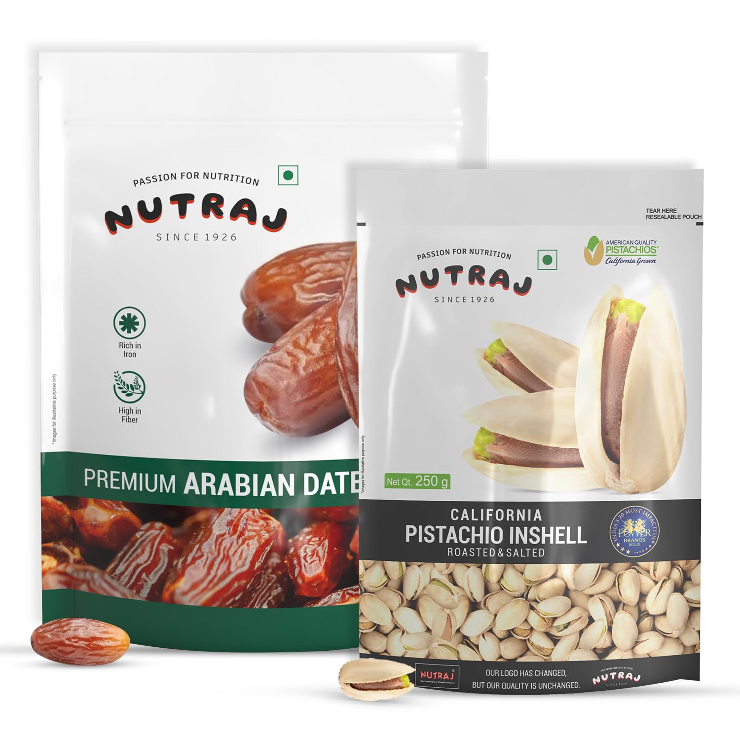 • Pack Content: Contains a pack of Nutraj California Pistachios 250g and Arabian Dates 500g.