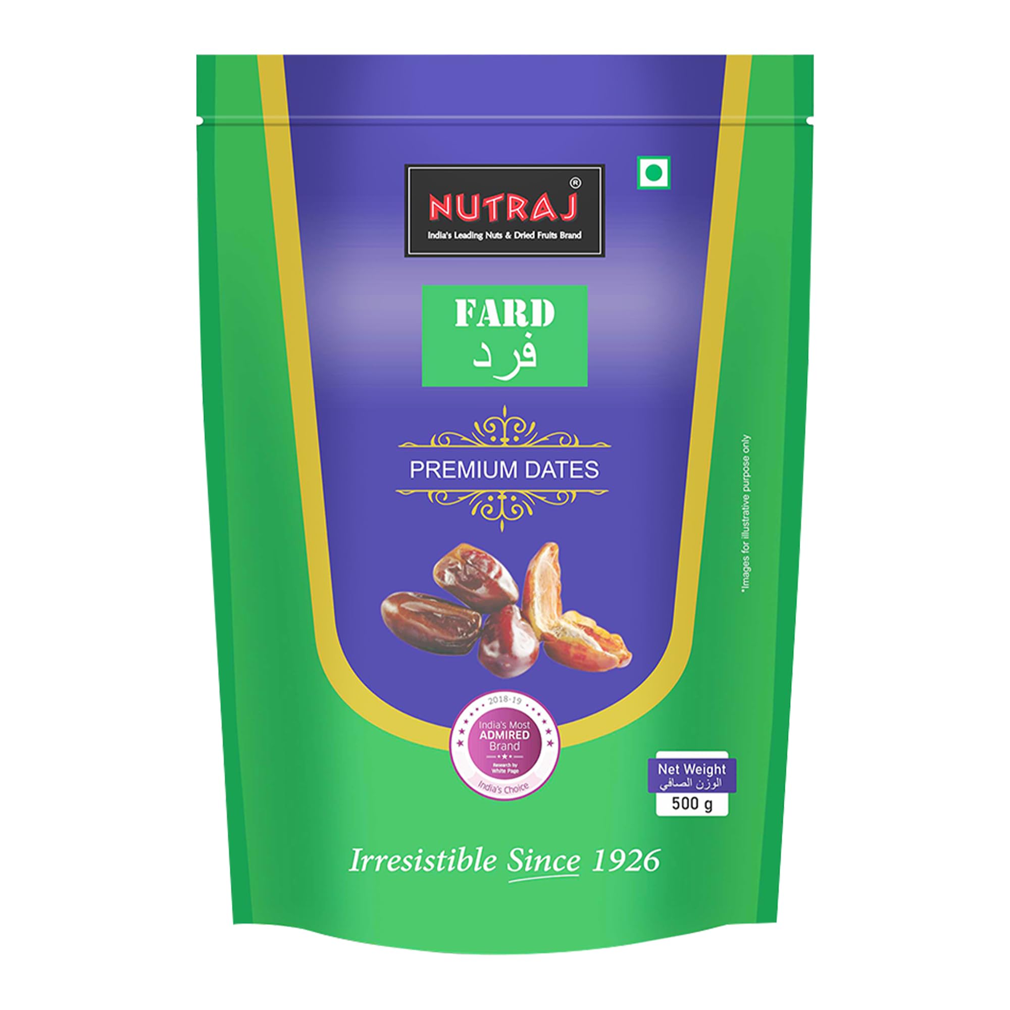 • Nutraj Fard Dates in a convenient resealable pouch for lasting freshness.