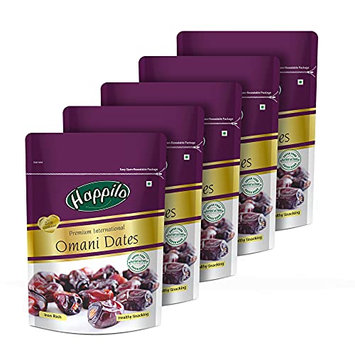 Happilo Premium International Omani Dates Value Pack Pouch 680g Happilo omani dates also known as khajoor are one of worlds most delicious farm fresh dates. Omani dates have the hidden quality of boosting energy instantly! Hence they are not just apt during festive season but are also a must-have snack for the entire year. It is superfood for super energy levels. Our products are packed under highest level of hygiene retaining all the goodness of nature. Happilo Premium International Omani Dates 250g (Pack of 5) Happilo has travelled the world to get the finest gourmet dry fruits. They are one of the most nutritious dried fruits in the world they're a yummy healthy snack. Great for Snacking adding to Cereal Cooking and Baking. High Antioxidants Dietary Fiber No Gluten Non GMO Zero Trans Fat & Zero Cholesterol. Daily need products for a healthy and energetic life. Happilo Zip Lock Pouch with airtight seal to ensure the product is protected and fresh. Quality assured - Happilo products are rigorously tested against the industry's best quality standards.