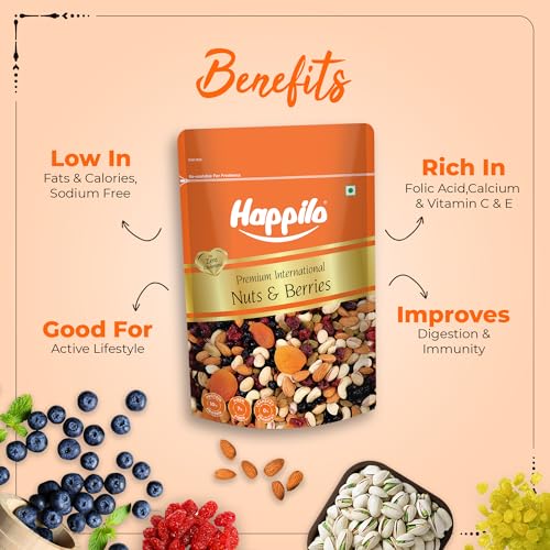 Nuts and Berries is an incredibly delicious and crunchy mix of Almonds Apricots Blueberries Cashew nuts Dried Cranberries Dried Cherries Pistachios and Raisins. This premium cocktail makes for a real great snack. These are simply nuts and fruits and nothing else. Time to be Happy Lovely and Healthy.