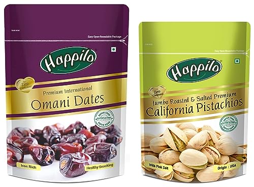 Happilo Omani dates are soft and sweet fresh farm dates. Dates have the hidden quality of boosting energy instantly. Happily pistachios are lightly salted crack open the shells to treat your taste buds for a snacking sensation. Pistachios are a wonderful fun & tasty snack which are lightly salted. Crack open the shells to treat your taste buds for a snacking sensation. Pistachios are especially rich in phytosterols which are directly associated with lowering cholesterol levels. Pistachios are a very quality plant source of protein providing adequate and balanced amounts of essential amino acids. Try this combo to experience the world of taste from Happilo.