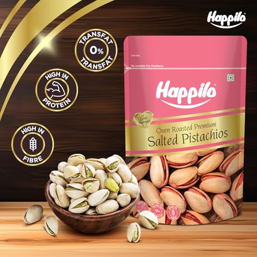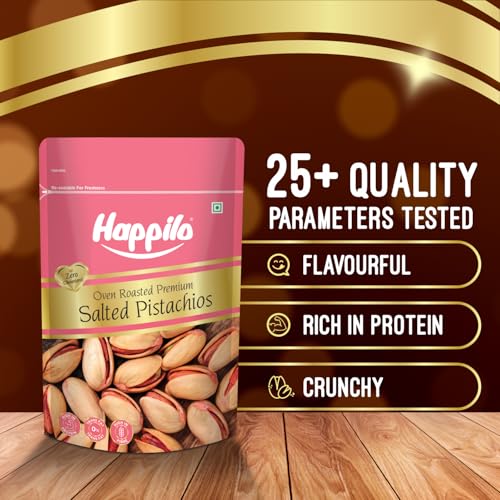 • Pistachios from Happilo are salted and roasted which enhances their delicious taste. They are of the yummiest flavor and will drive you nuts with their crunchiness and freshness.
